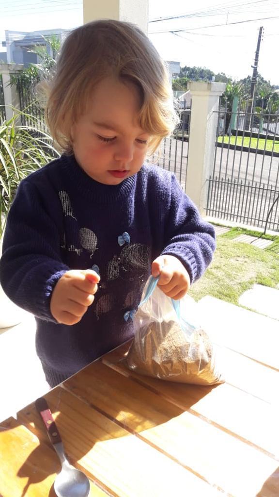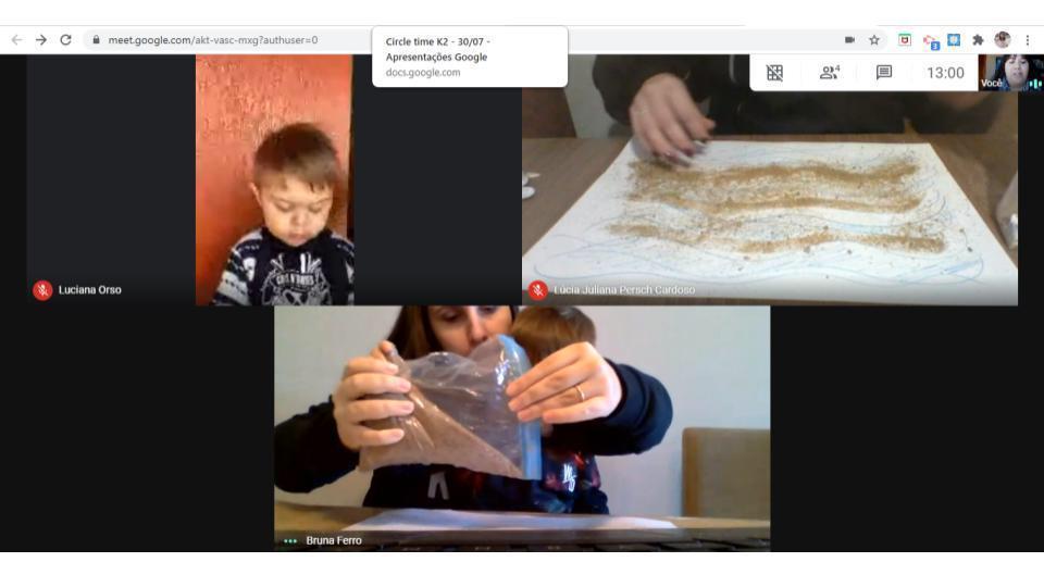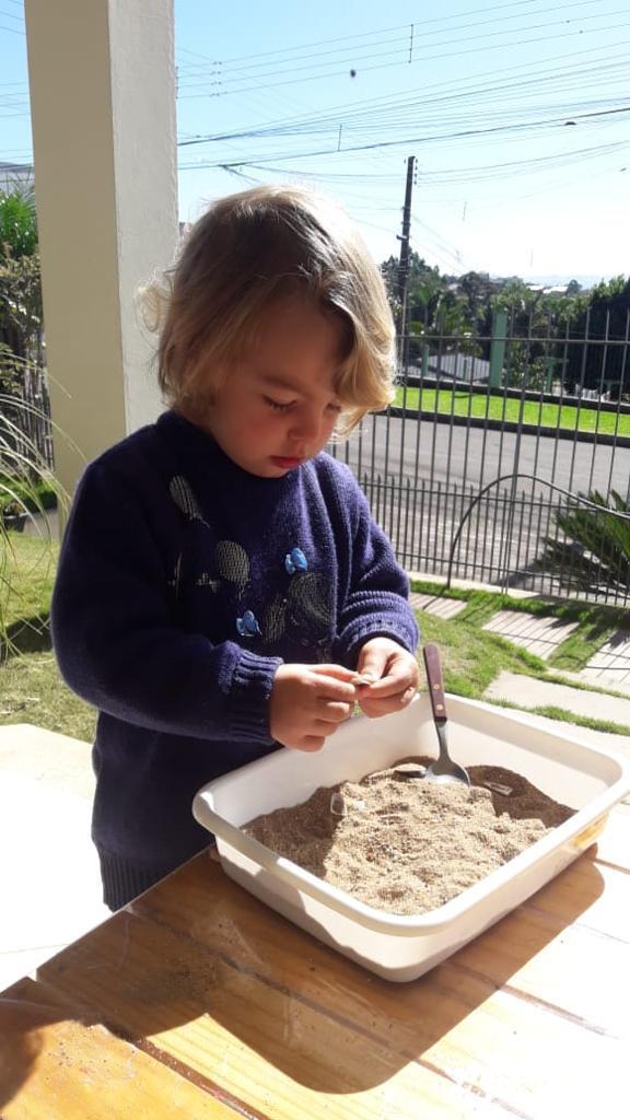 Uma das atividades realizadas pelas Teachers Damodara Ferrer e Cláudia Félix foi propor a confecção do mar em uma das aulas síncronas. Para tornar esse registro ainda mais especial e significativo, a areia utilizada na confecção foi a areia do pátio dos Níveis 2, localizado na Unidade. A areia foi coletada e separada para cada aluno em um saquinho plástico no qual também continha conchinhas do mar.