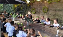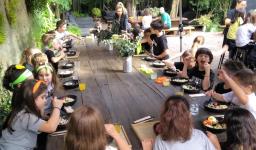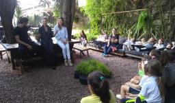 Seguindo as atividades, os alunos foram ao restaurante Eat Kitchen. No local, em inglês, aprenderam sobre a importância de uma alimentação saudável e realizaram o pedido do almoço. Após a refeição, os fornecedores de alimentos orgânicos locais conversaram com o grupo sobre as diferenças entre os alimentos orgânicos e com agrotóxico.