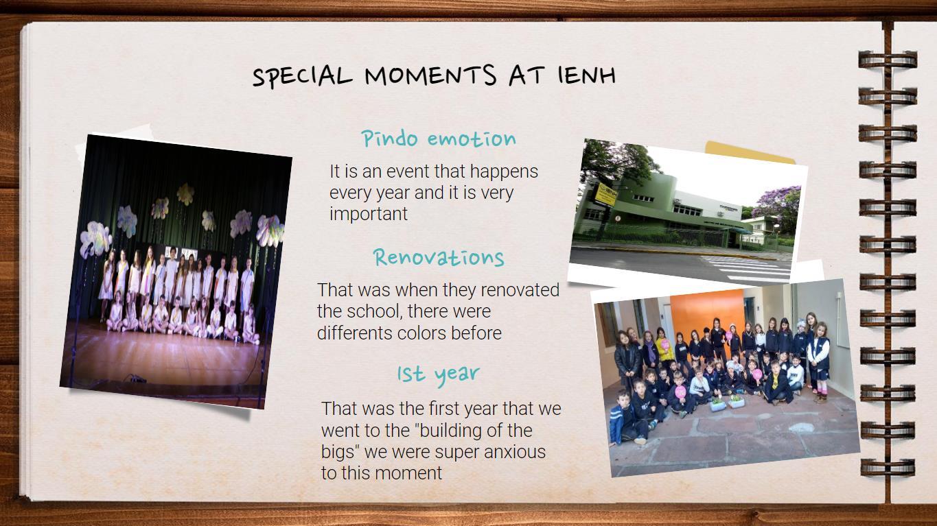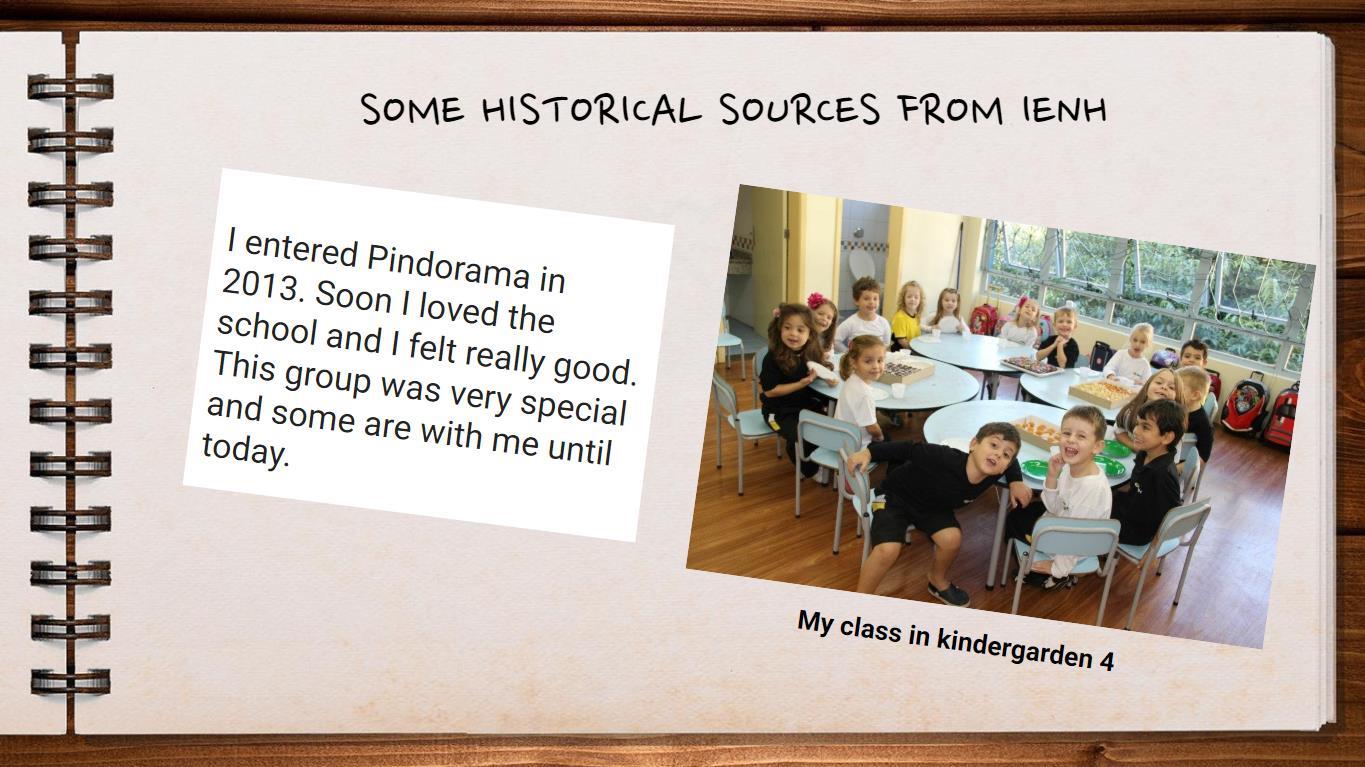 No Componente Curricular History, a partir do vídeo “The one about the virus”, os estudantes discutiram sobre como o momento vivido agora entrará para a História, ou seja, como será lembrado no futuro. Após, eles foram desafiados a fazer um diário registrando suas vivências na quarentena, refletindo sobre as mudanças de hábitos em sua rotina, aspectos positivos e negativos. Além disso, ao estudarem sobre fontes históricas em História, pesquisaram em suas fontes o que tinham de registros da escola e da vida estudantil deles na Instituição, montando um álbum de memórias de suas experiências na IENH.