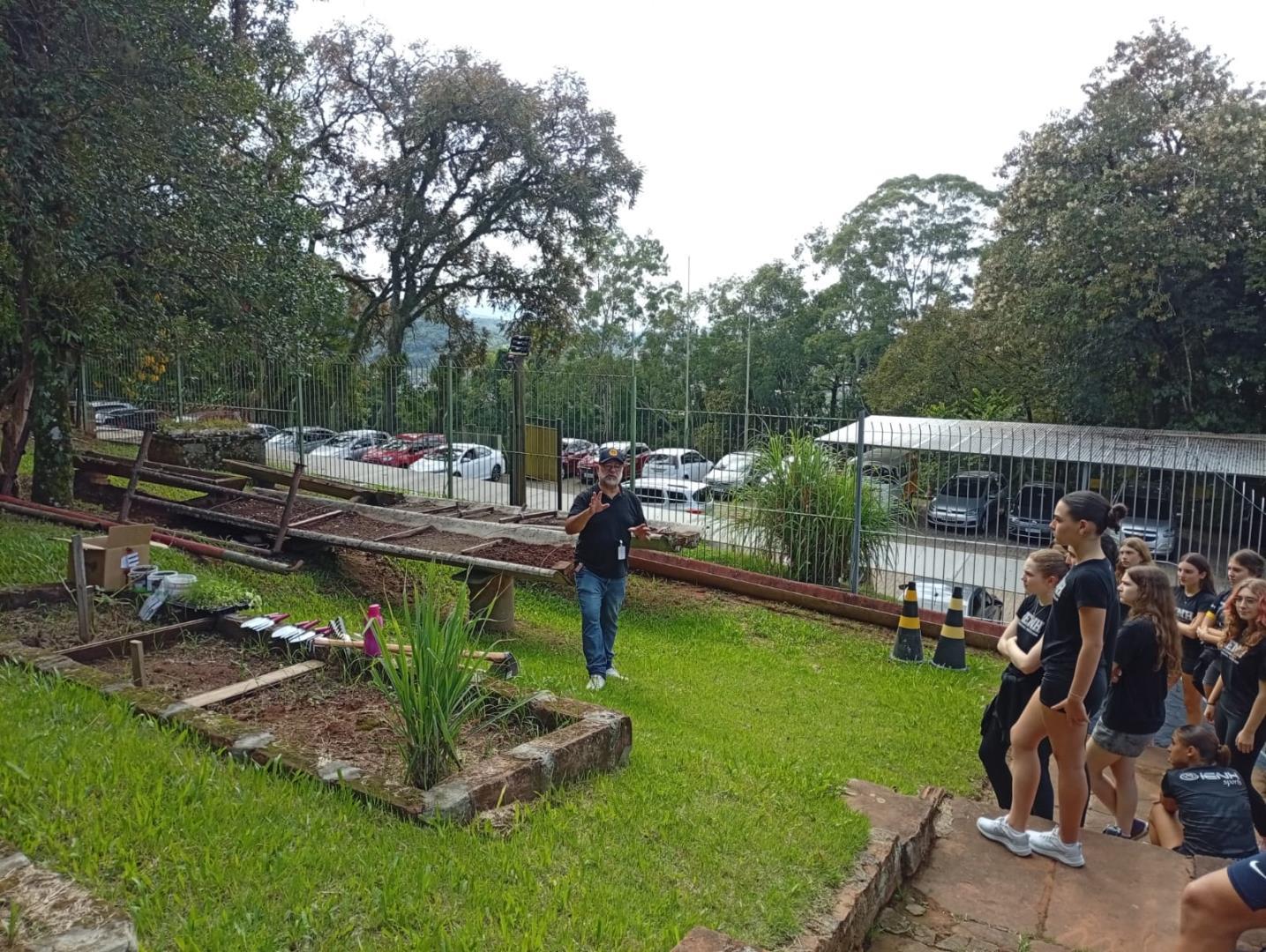 Na sequência, os estudantes participaram de uma atividade prática na horta da escola. Durante a vivência, colocaram a mão na terra, preparando o solo, organizando os canteiros e realizando o plantio de mudas de hortaliças. O contato direto com os ciclos naturais ampliou a percepção sobre a importância do cuidado com o solo, a água e os seres vivos envolvidos nesse processo.