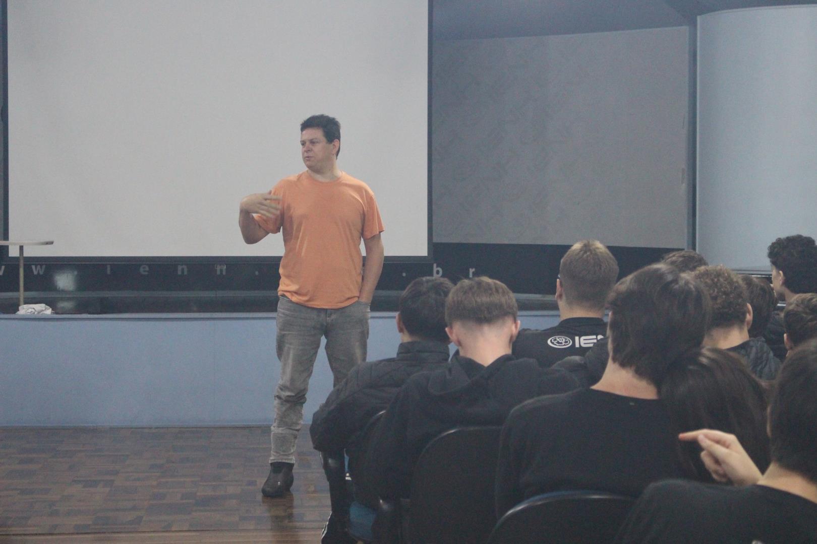Estudantes das turmas de 2nd grade do Ensino Médio da IENH – Unidade Fundação Evangélica participaram, no dia 28 de abril, da aula inaugural do Cine IENH. O encontro contou com a presença de Anderson Zang, artista visual, iluminador e arteterapeuta, que conversou com as turmas sobre como surge uma ideia e os caminhos do processo criativo.