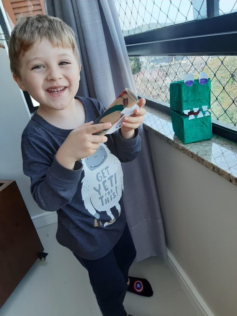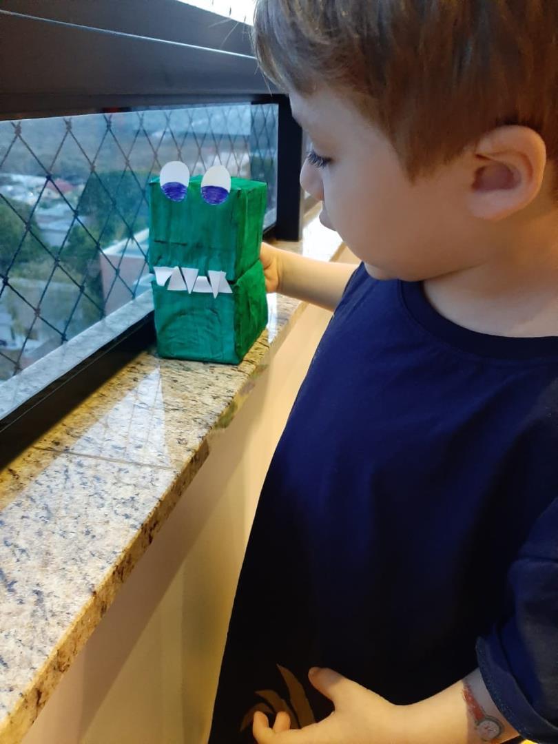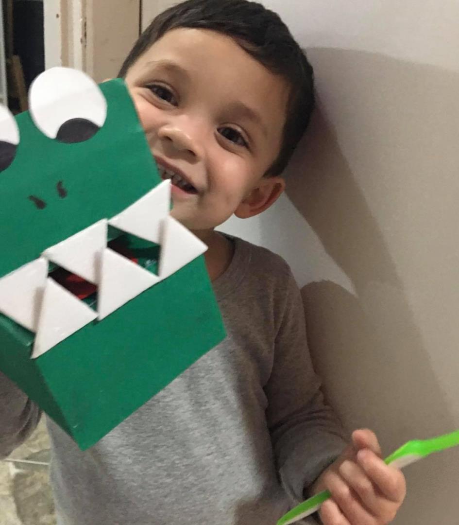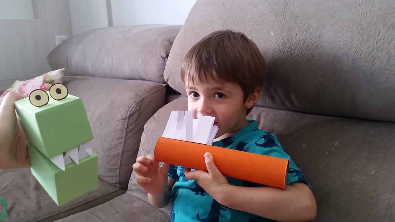 A partir da história contada na Língua Materna, as crianças confeccionaram uma escova de dentes para escovar os dentes do jacaré. E então as Teachers Claudia Felix e Damodara Ferrer ensinaram uma canção sobre escovar os dentes, tornando a proposta ainda mais divertida.