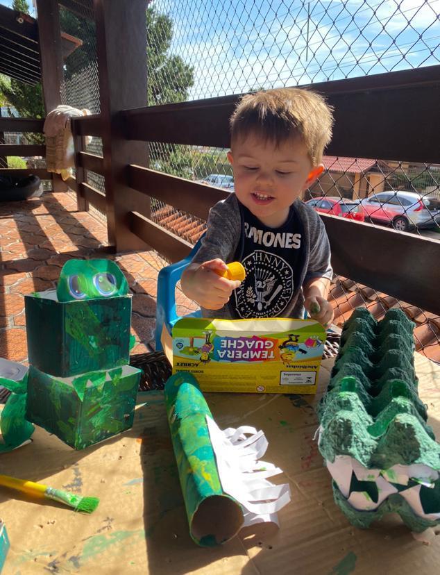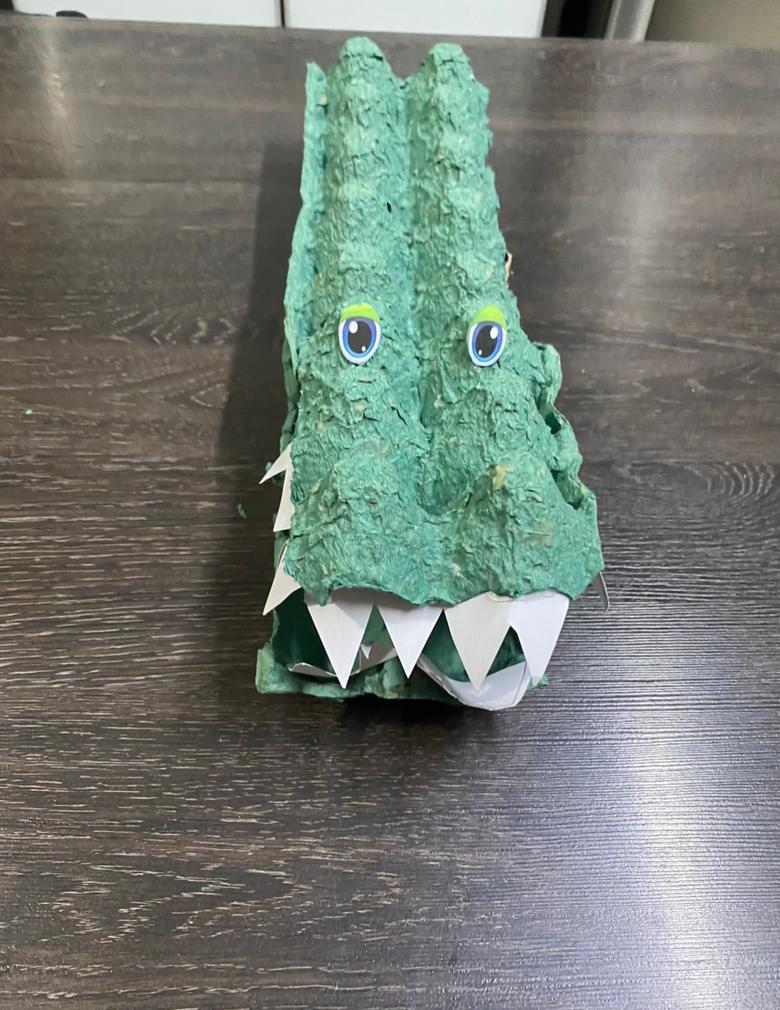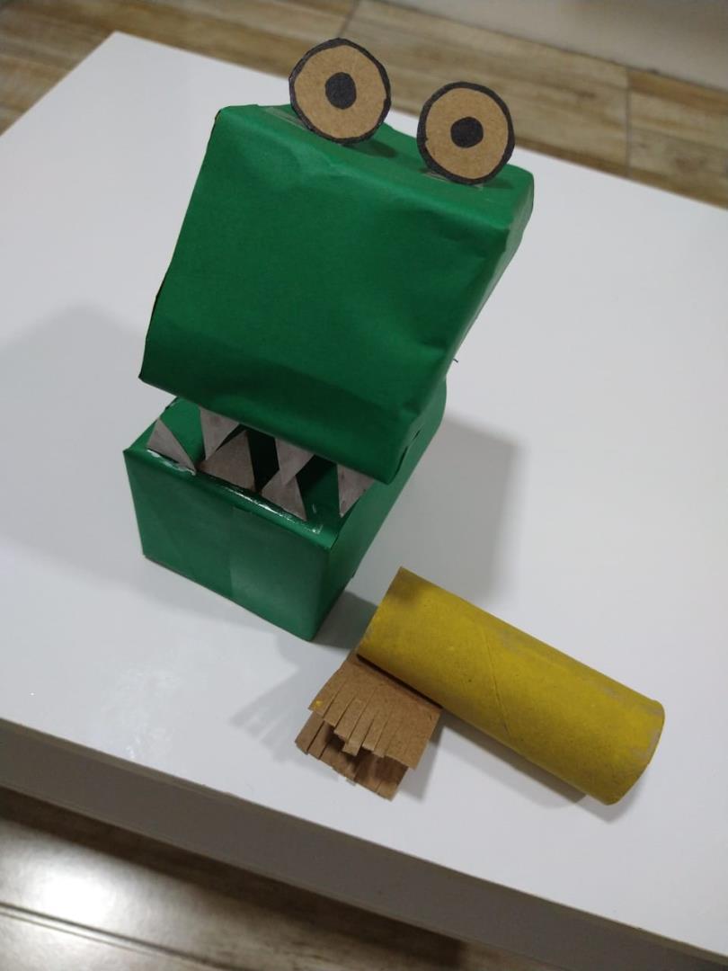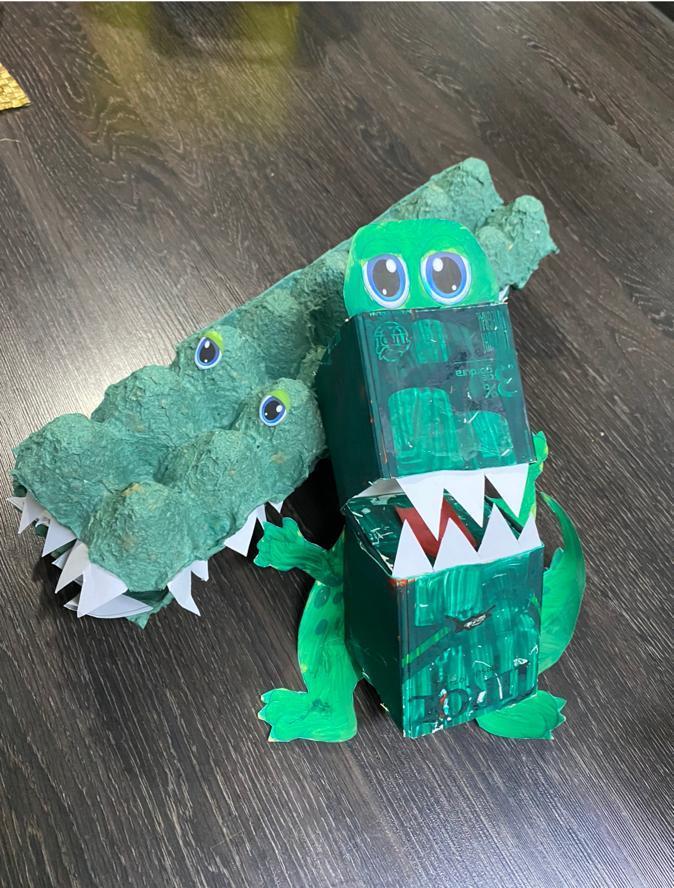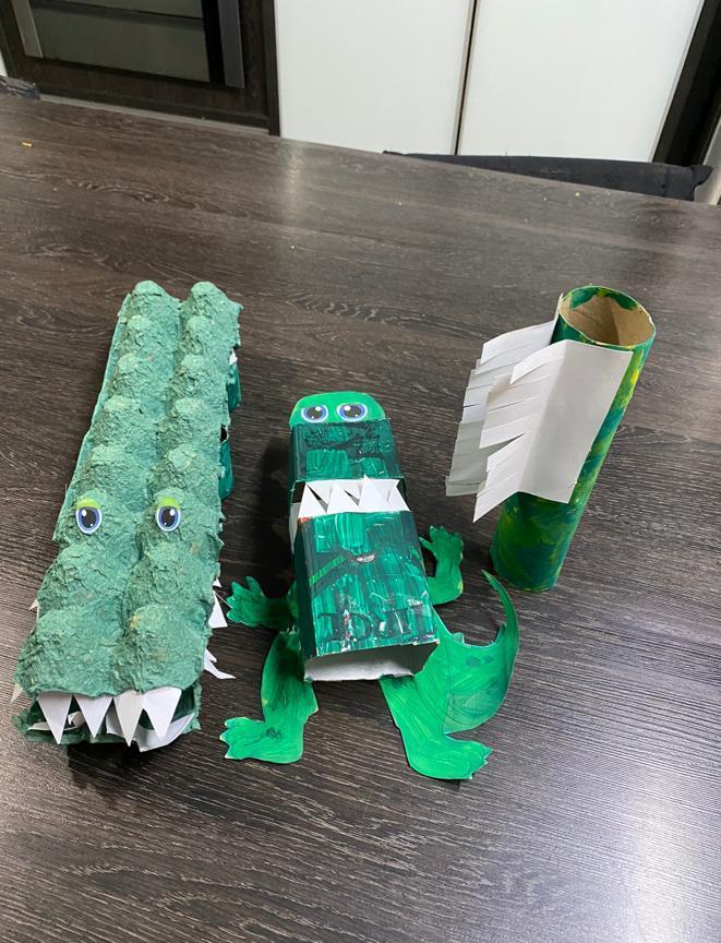 No momento, os estudantes aprenderam sobre o jacaré. Buscando a ressignificação desse animal, eles acabaram recriando o jacaré com o uso de materiais recicláveis na aula de Língua Inglesa.
