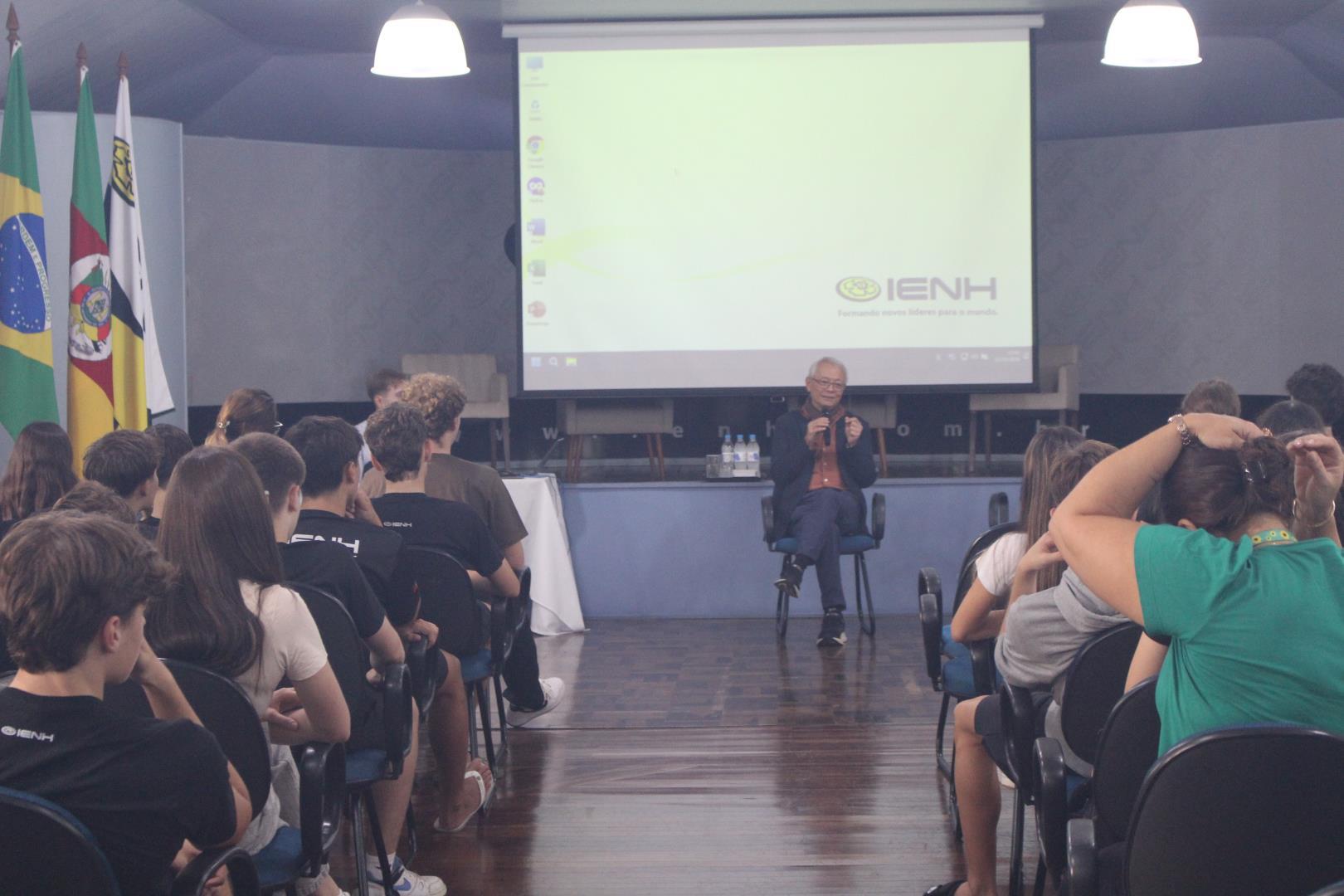 Durante o encontro, os estudantes também puderam conhecer a trajetória do ex-aluno da IENH Bernardo Leist Mosmann, que participou do intercâmbio da instituição no Canadá e, posteriormente, decidiu seguir seus estudos no país. Hoje, Bernardo se destaca por seu desempenho acadêmico, tendo conquistado bolsas de estudo e reconhecimento em sua trajetória educacional.