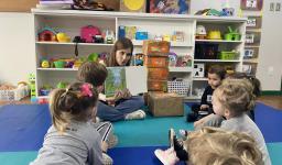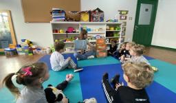 Em Língua Materna, o livro utilizado foi “A Casa Sonolenta” de Audrey Wood, onde os personagens da história se empilhavam numa mesma cama, até que todos caíram por causa da pulga que os deixava dormir. A professora contou a história utilizando caixas de papelão com as imagens dos personagens, e conforme ela ia narrando, os personagens iam se empilhando uns sobre os outros.