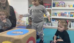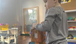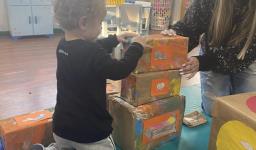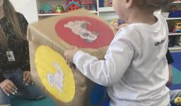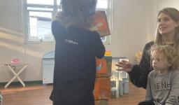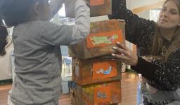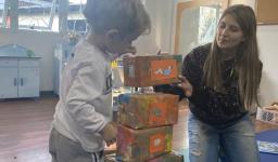 Após a contação da história, as crianças foram convidadas a jogar um jogo em duplas. Nesse, cada um deveria esperar a sua vez para, em sua rodada, empilhar a caixa sorteada pela teacher.