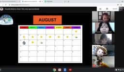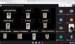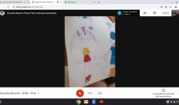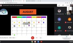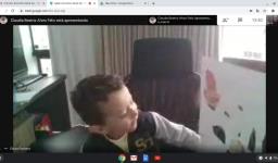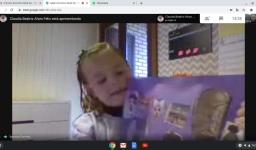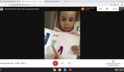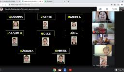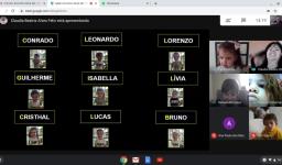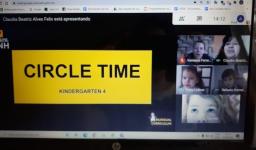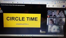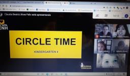 Nas aulas, a Teacher Claudia Felix propõe um momento de rodinha virtual, compartilhando na tela os nomes e as fotos das crianças para que possam reconhecer seu nome, como fariam na chamada presencial. Além disso, são propostos momentos para cantar e dançar, e de questionamentos como “How is the weather today?”, “What day is today?”, que são prontamente respondidos pelas crianças.