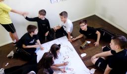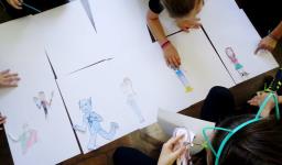Em seguida, os estudantes passaram a trabalhar de forma conjunta, reunindo os heróis e analisando suas características e missões. A Professora Letícia entregou a eles um painel em branco e, a partir disso, o trabalho foi colaborativo, precisamente à 34 mãos. Eles formaram ligas de heróis e decidiram qual lugar do painel ocupariam, qual seria a habilidade e a fraqueza que registrariam em um balão de fala, fazendo uso da identidade criada e das regras gramaticais estudadas, e também como seria o cenário coletivo. Todos colaram seus heróis no local definido no painel e ajudaram a desenhar e colorir o cenário de fundo. O resultado do trabalho pode ser conferido no mural disponível na entrada da escola.