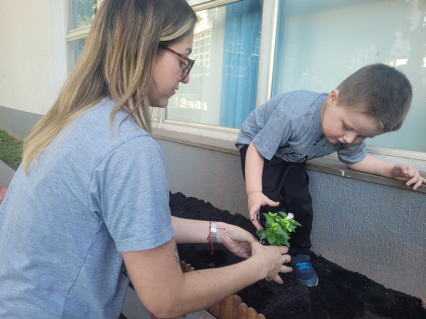 Após as observações, os pequenos decidiram plantar flores e ervas no pátio da Educação Infantil, tornando o ambiente mais colorido e agradável. O momento foi registrado em fotos e vídeos, com relatos espontâneos das crianças sobre suas descobertas e percepções.