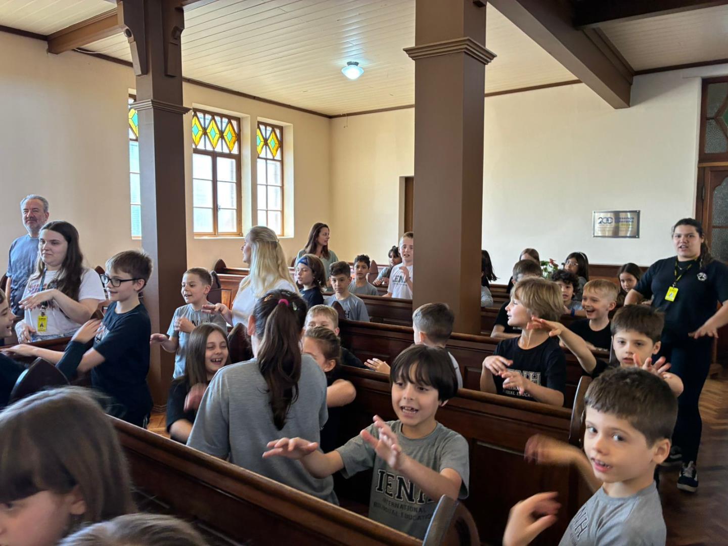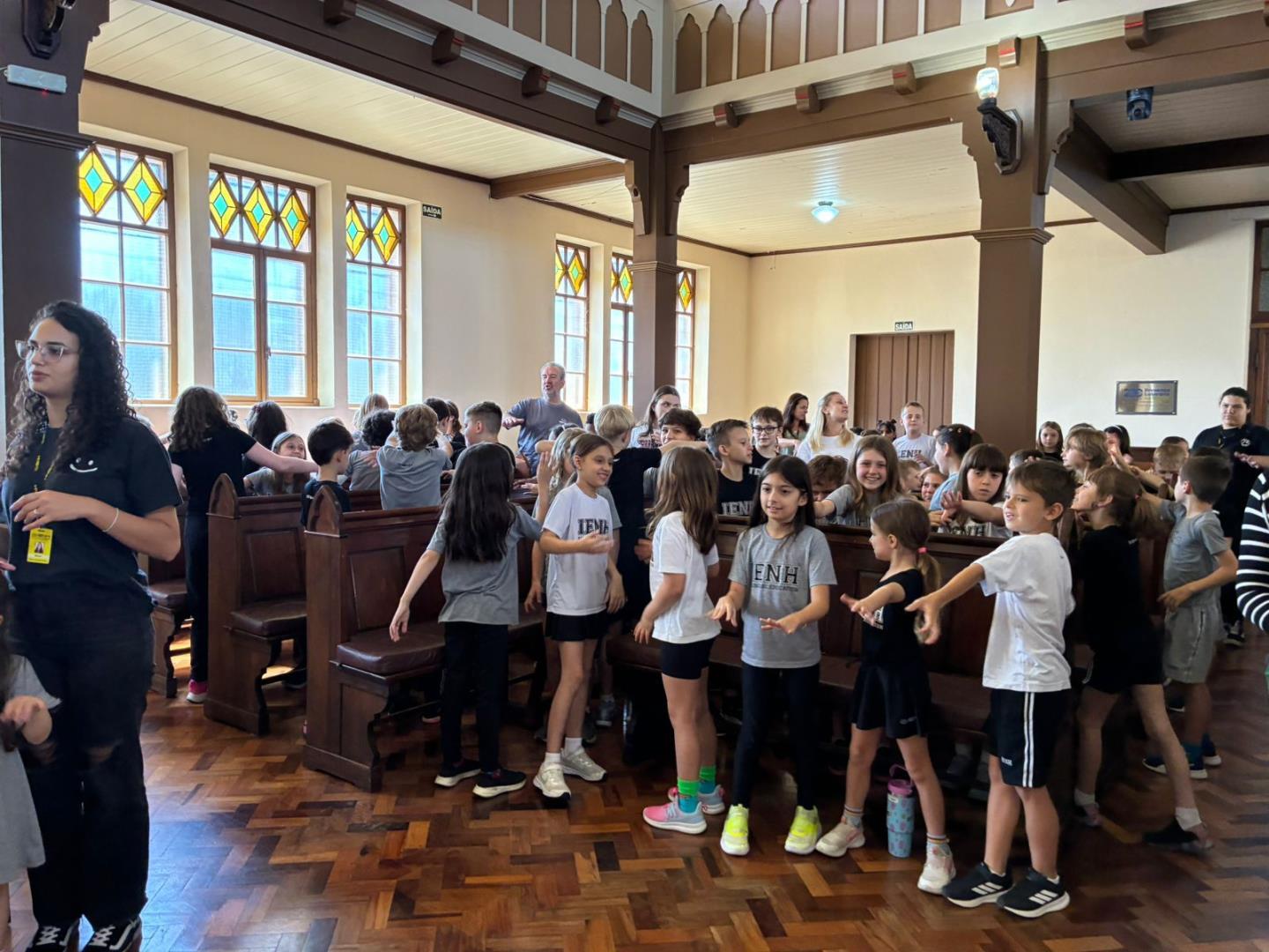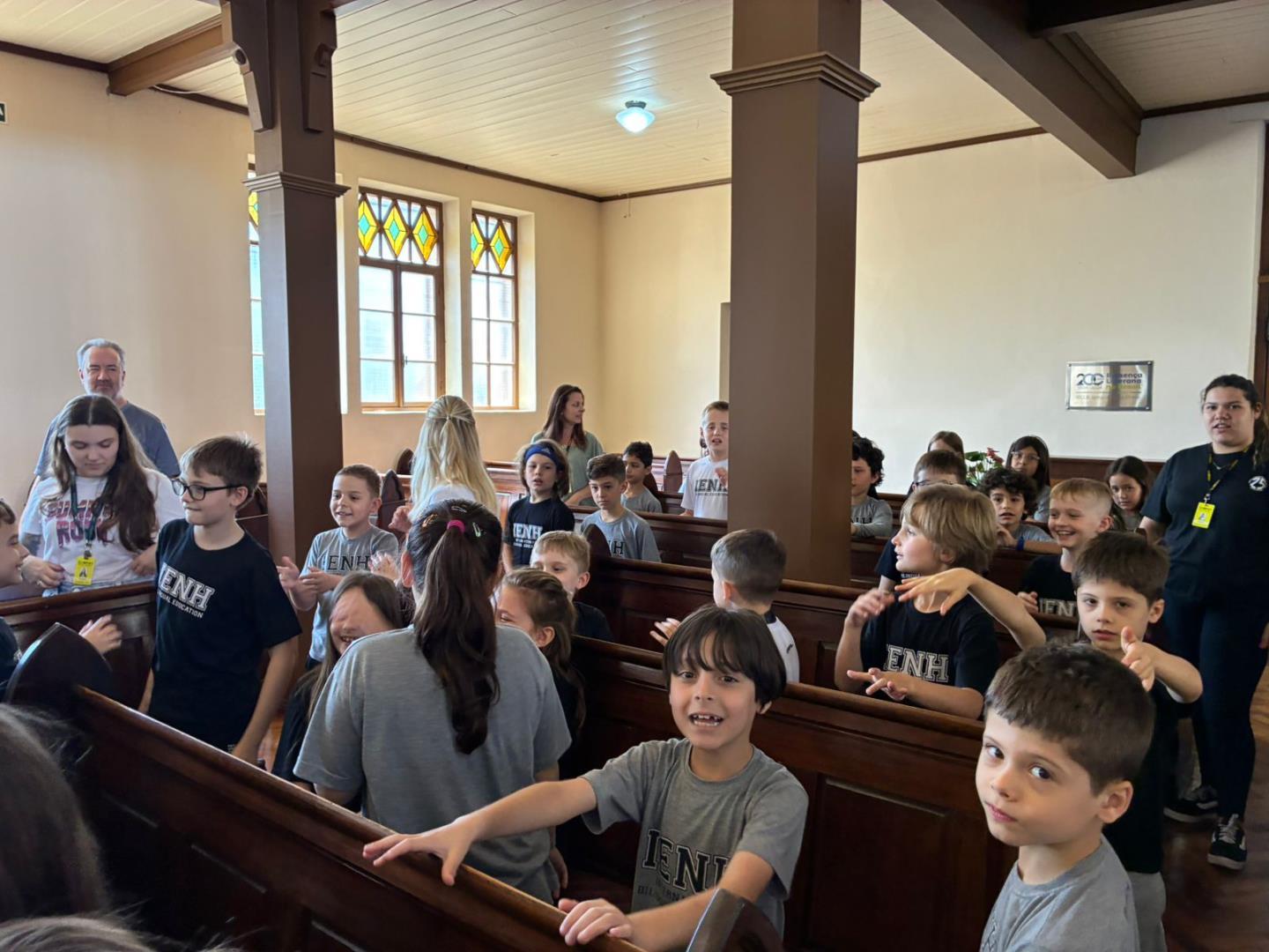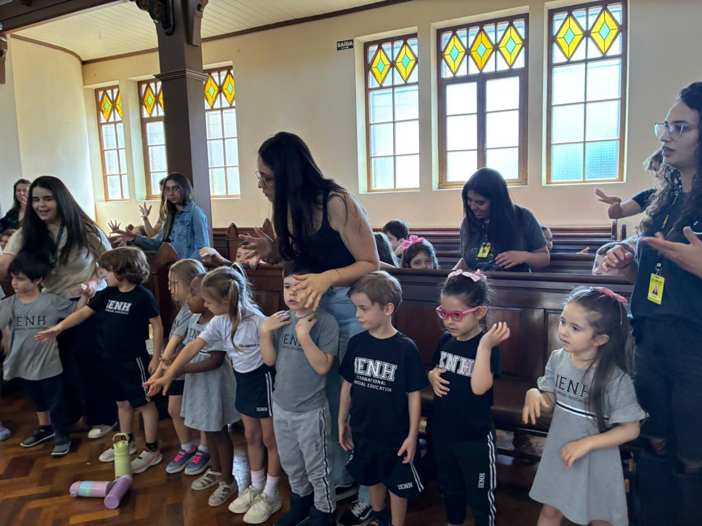 Na tarde da quinta-feira, 11 de dezembro, estudantes do Kindergarten 4 ao Year 4 da Educação Infantil e Ensino Fundamental do Currículo Internacional Bilíngue da IENH – Unidade Pindorama participaram de um momento especial de Advento e Natal na Igreja Três Reis Magos. A atividade iniciou com uma acolhida conduzida pela coordenadora de Unidade, Karina Spessato, que recebeu as turmas e marcou simbolicamente o começo do encontro com o toque do sino da igreja.