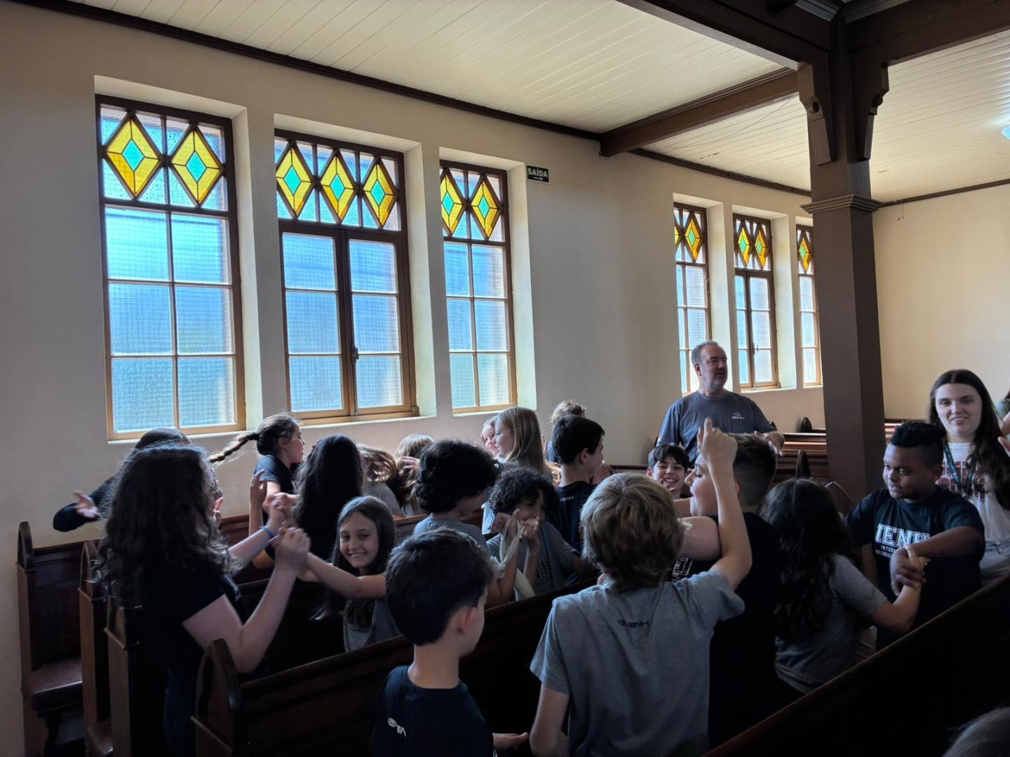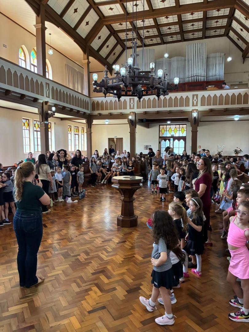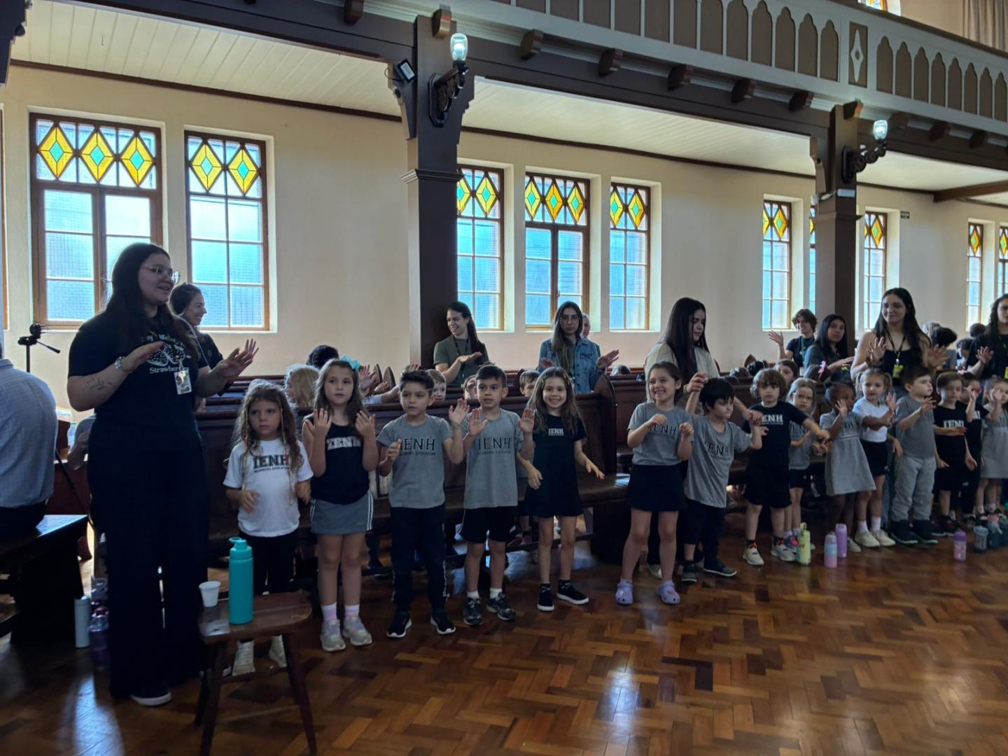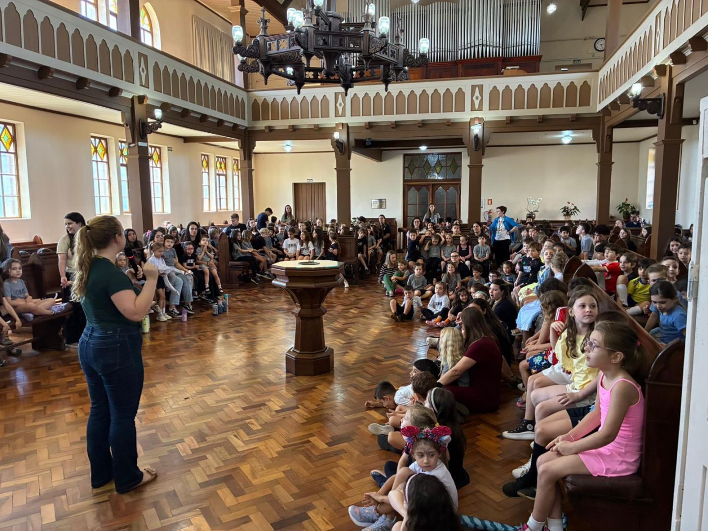 Na tarde da quinta-feira, 11 de dezembro, estudantes do Kindergarten 4 ao Year 4 da Educação Infantil e Ensino Fundamental do Currículo Internacional Bilíngue da IENH – Unidade Pindorama participaram de um momento especial de Advento e Natal na Igreja Três Reis Magos. A atividade iniciou com uma acolhida conduzida pela coordenadora de Unidade, Karina Spessato, que recebeu as turmas e marcou simbolicamente o começo do encontro com o toque do sino da igreja.