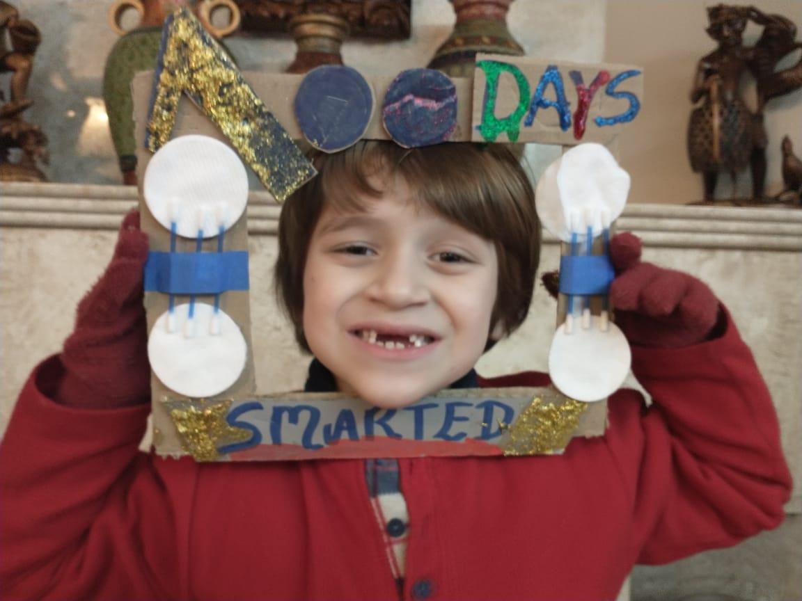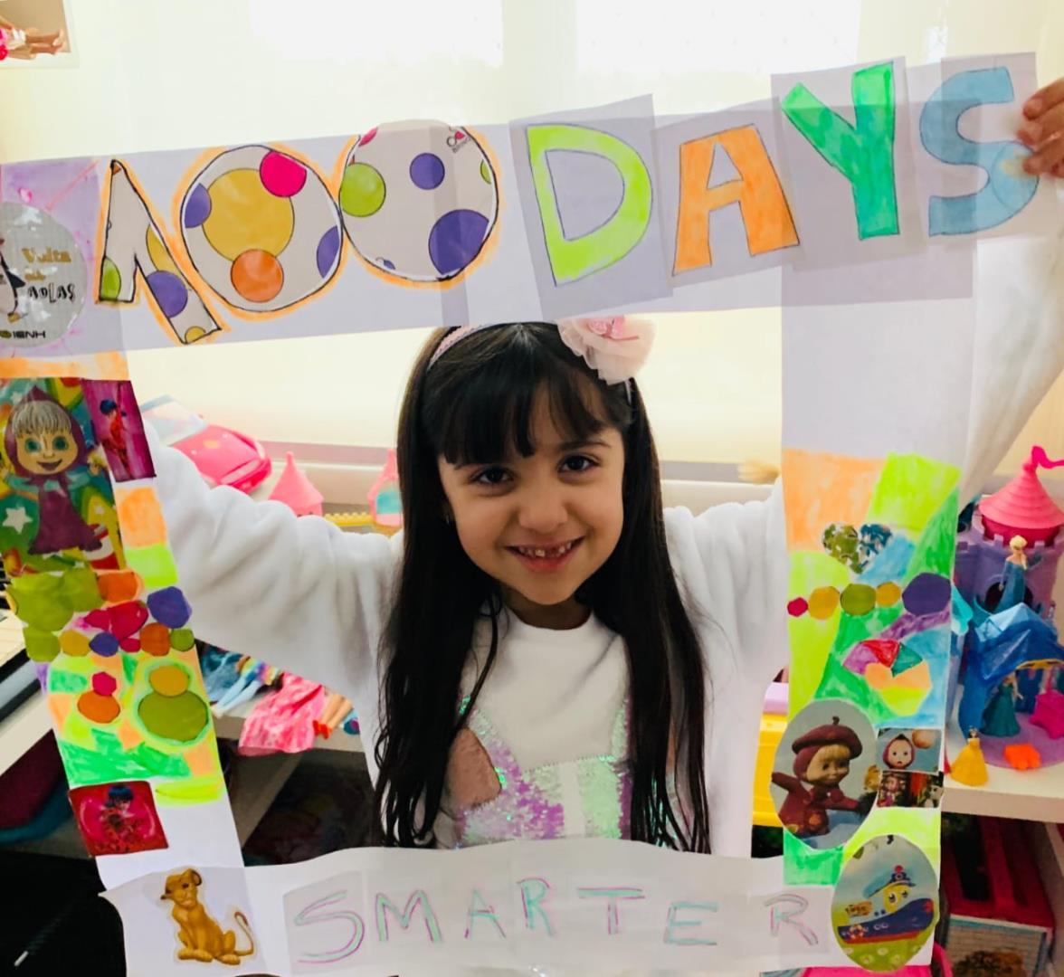 A primeira tarefa dos alunos foi criar um “photo booth”, uma moldura de fotos decorada com o tema da semana. Além disso, eles brincaram com os números de 1 até 100, fizeram palitinhos de frutas dos 100 dias, cantaram e realizaram registros escritos utlizando o Billy’s book. A última tarefa foi utilizar um aplicativo para modificar uma foto atual e ver como cada um seria no futuro, com 100 anos de idade!