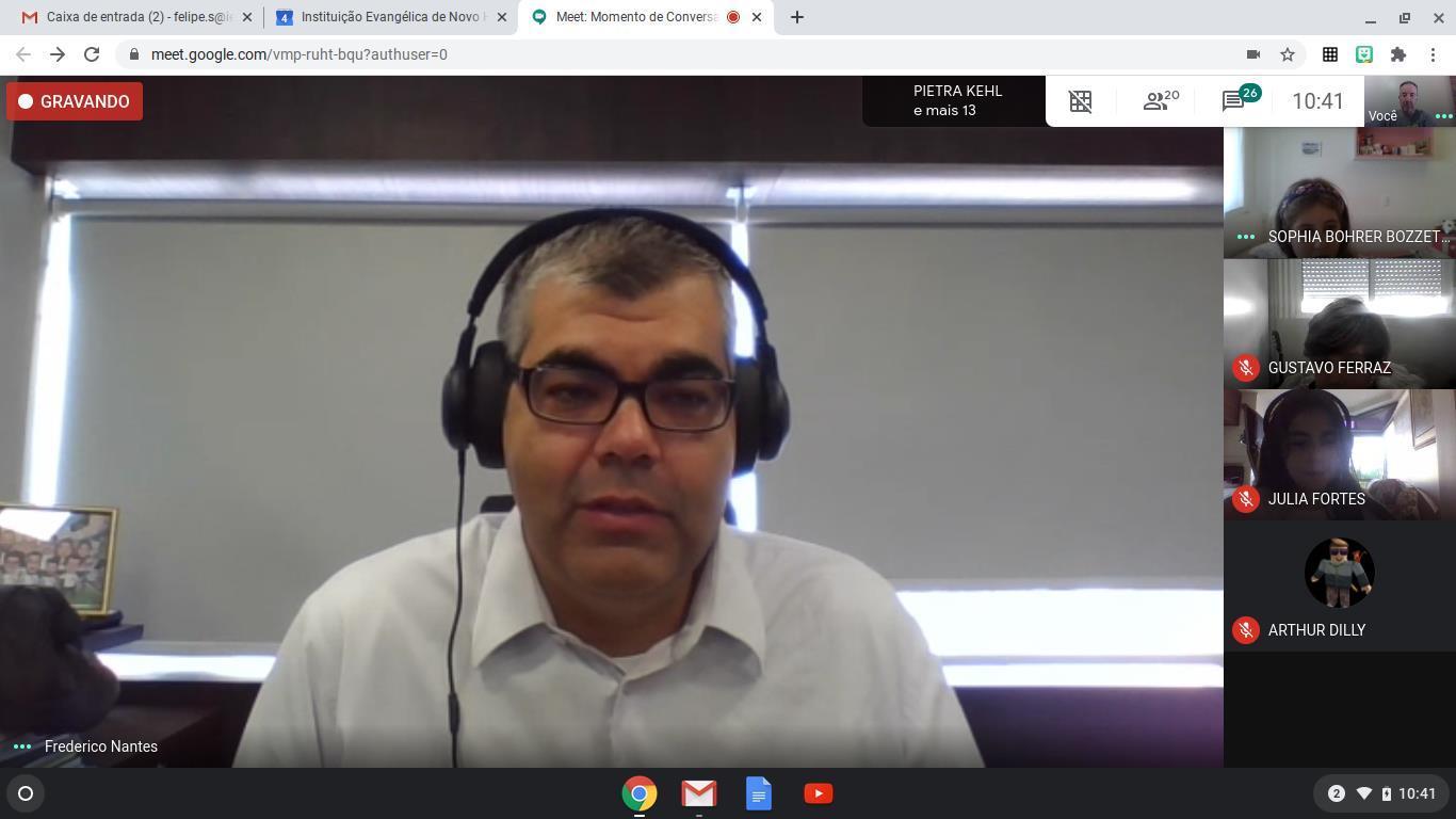 No primeiro encontro, Frederico Nantes foi o profissional que conversou com as turmas. Ele é Diretor de Competições de Clubes da CONMEBOL e também foi aluno e atleta da IENH. No bate-papo, Nantes falou sobre o período em que era aluno da Unidade Fundação Evangélica e sobre sua função atual no esporte. O Diretor também abordou o significado do esporte e os principais ensinamentos que a prática esportiva trouxe para a sua vida. Ao final, comentou sobre a importância da rotina para os atletas.