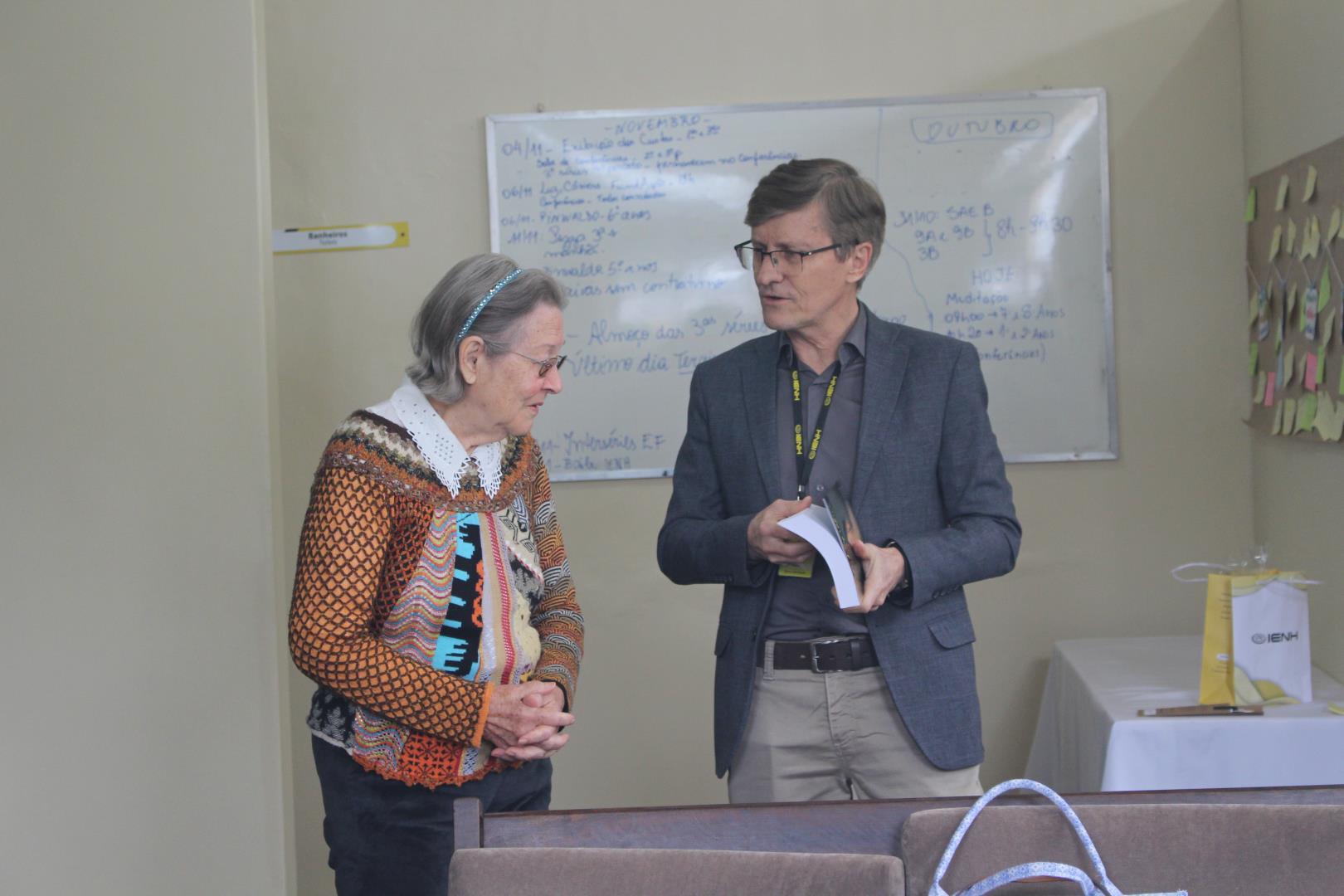 No dia 31 de outubro, a ex-professora da IENH - Unidade Fundação Evangélica, Liti Belinha Rheinheimer, retornou à escola para uma visita repleta de lembranças e significado. Recebida pelo diretor geral Seno Leonhardt e pelos professores, ela pôde rever o ambiente escolar e entregar doações de livros para o acervo da biblioteca.