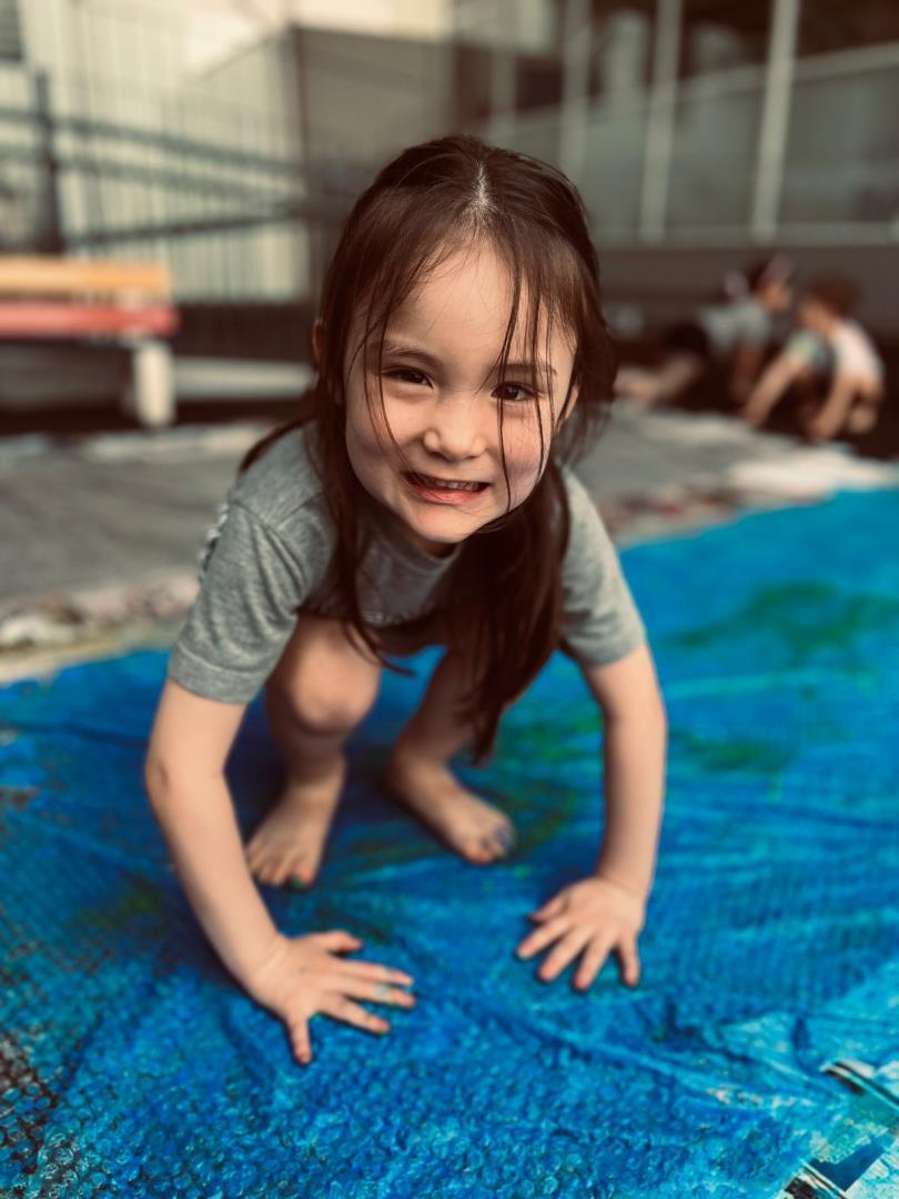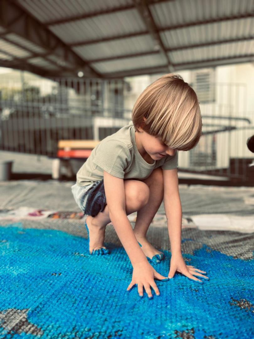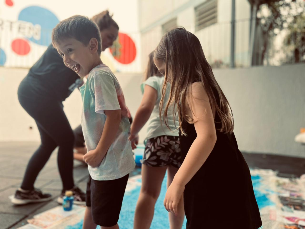 Usando tinta azul lavável e contando com as próprias mãos e pés como ferramentas, os estudantes exploraram livremente a textura do plástico bolha, o estalar das bolhas e a sensação da tinta. O espaço se transformou em um ambiente de alegria, movimento e curiosidade, sempre acompanhado pela teacher, que incentivou a linguagem, a exploração e a expressão corporal.
