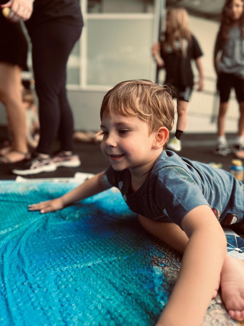 Ao final da vivência, o grupo se reuniu para observar o resultado: um mar azul vibrante, cheio de marcas, formas e texturas criadas pelas próprias crianças. Mais do que o produto final, o destaque foi a valorização do processo, da criatividade e do trabalho coletivo.
