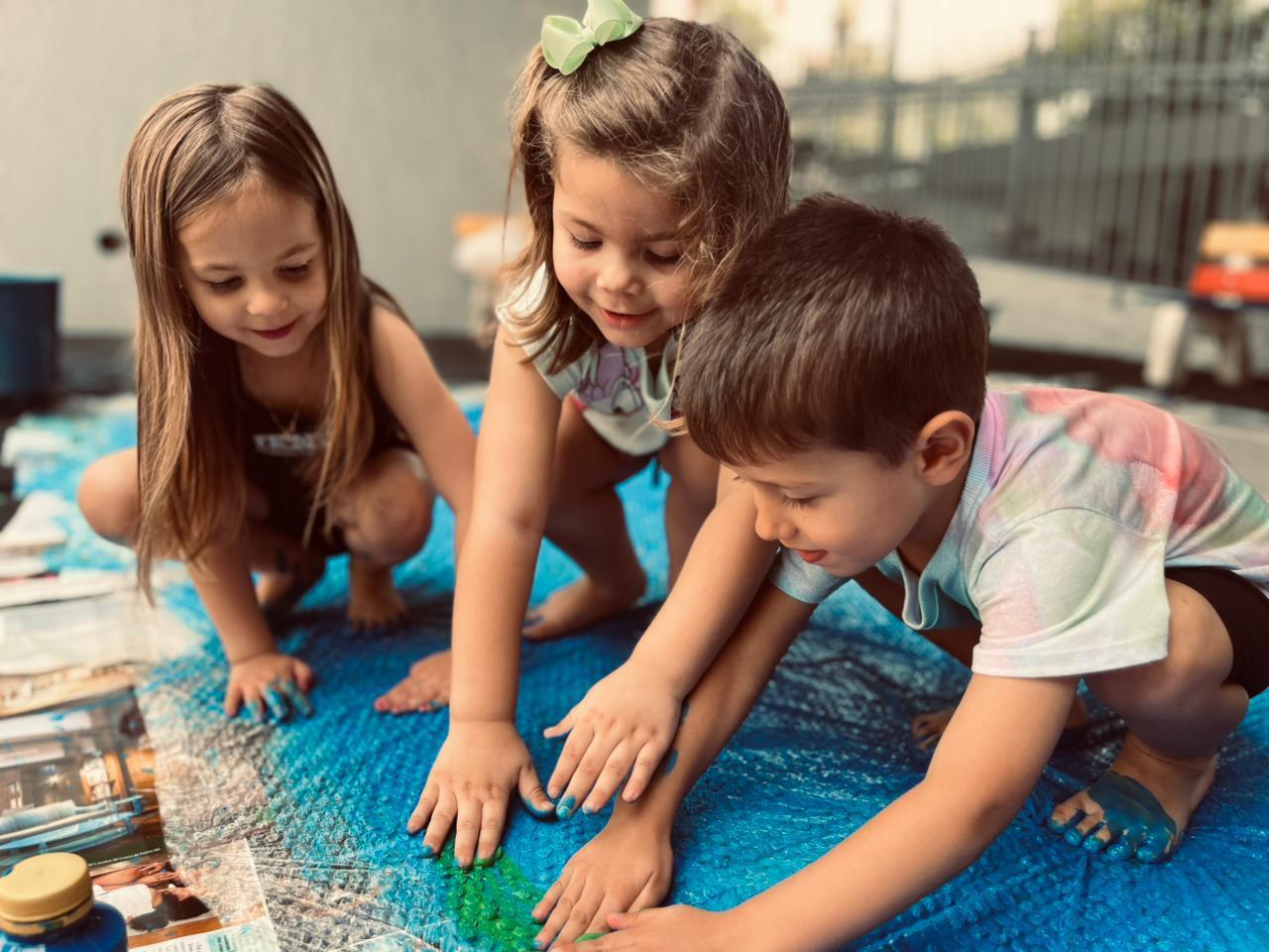 Para iniciar o momento, a teacher Daniela Brecher convidou o grupo a imaginar o oceano, ouvindo o som das ondas e conversando sobre suas cores e os animais marinhos. A atmosfera de encantamento aumentou quando as crianças encontraram um grande plástico bolha estendido pelo chão, que serviria de base para a construção de um mar coletivo.