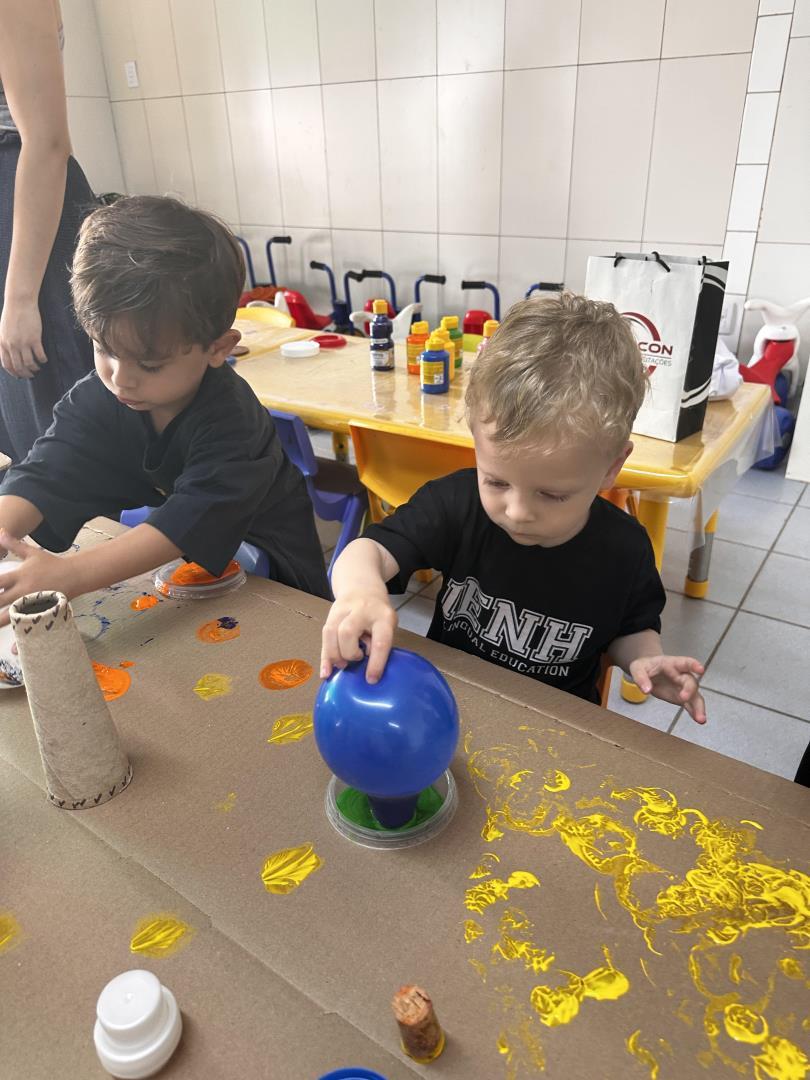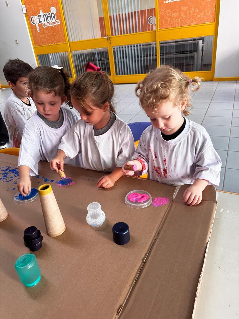 Na sequência, as turmas se deslocaram até um espaço preparado para a pintura, onde realizaram uma releitura coletiva da obra em um grande papelão. Utilizando tintas e os materiais explorados anteriormente como carimbos, as crianças criaram composições repletas de bolinhas, experimentando cores, formas e diferentes possibilidades de expressão.