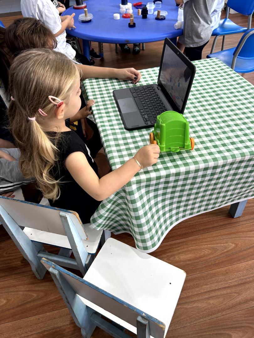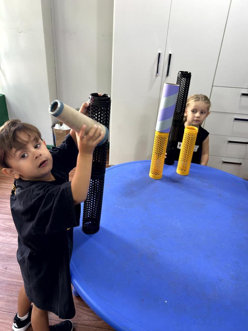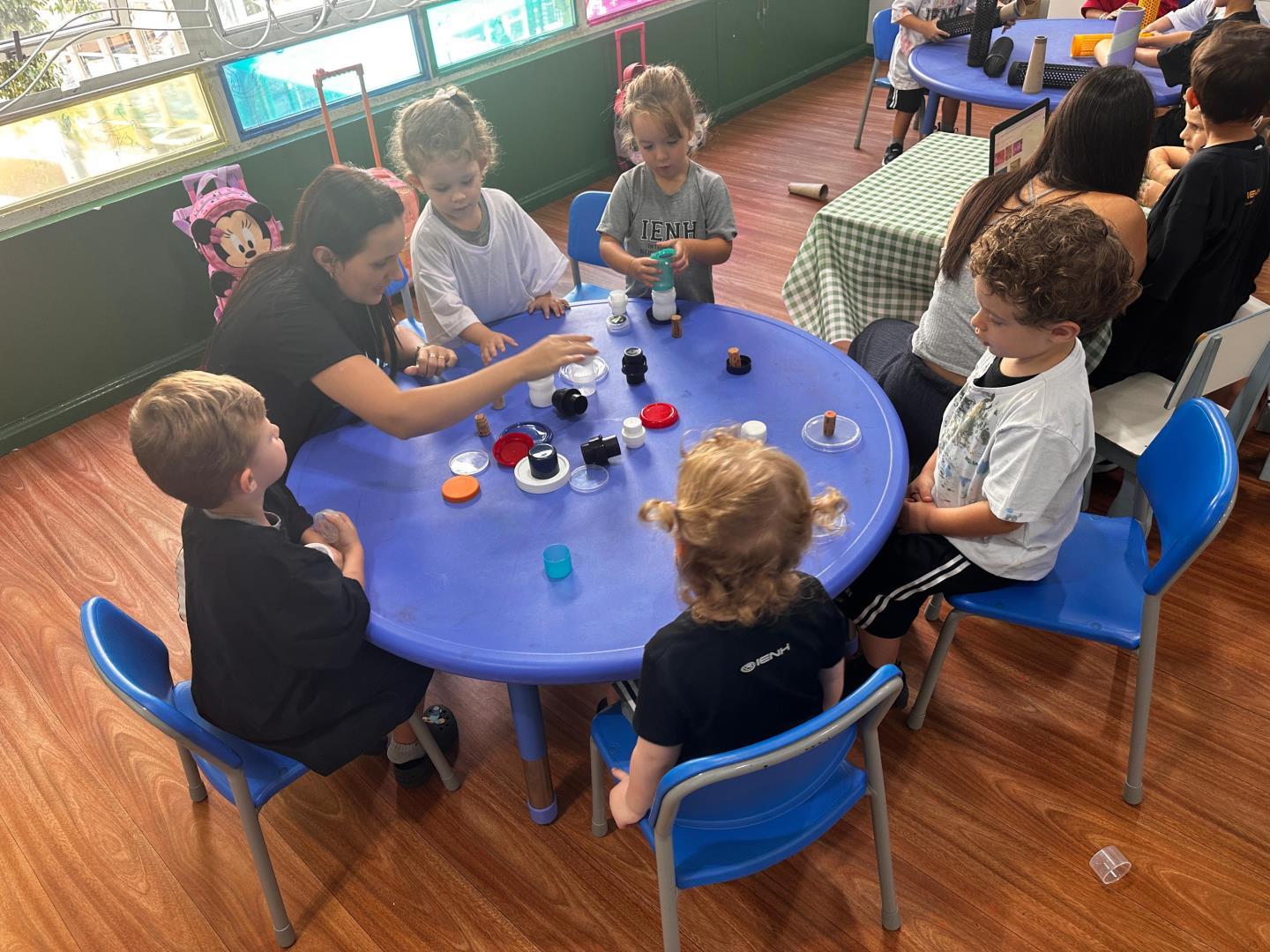 Inicialmente, as crianças participaram de um momento de Learning Center em sala de aula, explorando diferentes materiais como rolhas, tampinhas, balões e cones. Esses elementos foram observados e manipulados livremente, estimulando a curiosidade e a percepção de formas e texturas. Durante esse momento, os alunos também assistiram a um breve vídeo sobre a obra, ampliando o repertório visual e artístico.