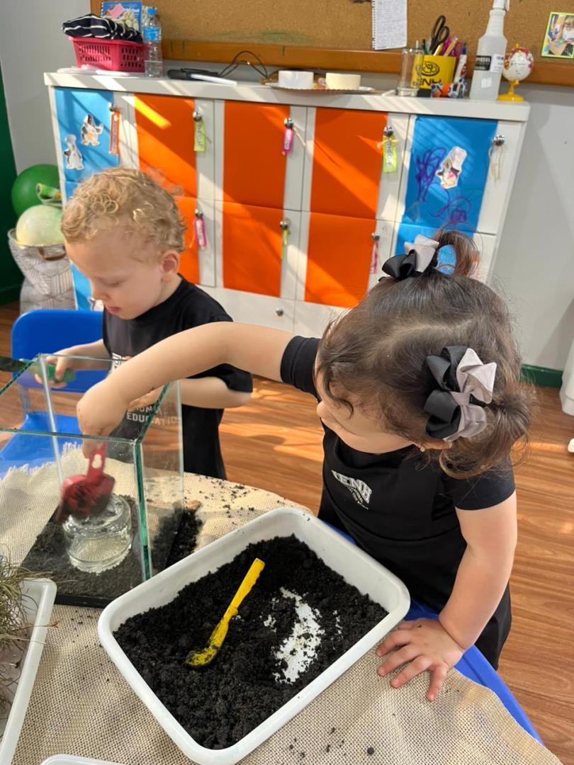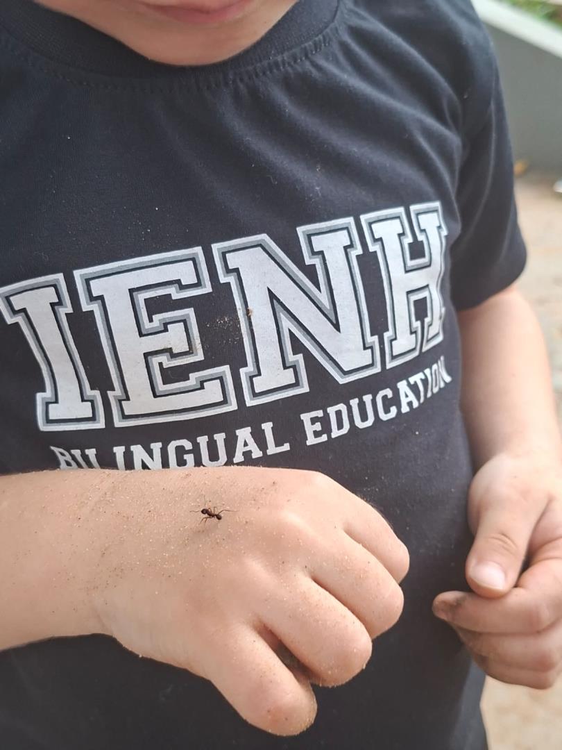 Ao longo da semana, os estudantes exploraram o universo das formigas e de seus formigueiros por meio de diferentes atividades. Assistiram a vídeos educativos, cantaram a canção tradicional “The Ants Go Marching”, observaram formigas no pátio e coletaram elementos da natureza para compreender mais sobre o habitat desses pequenos insetos.