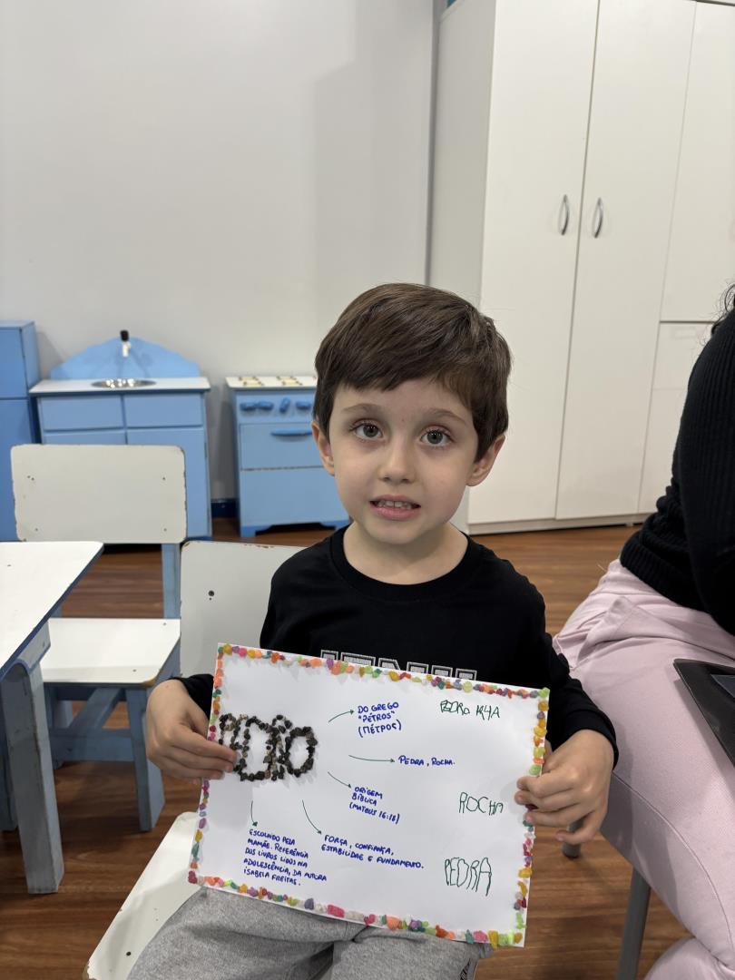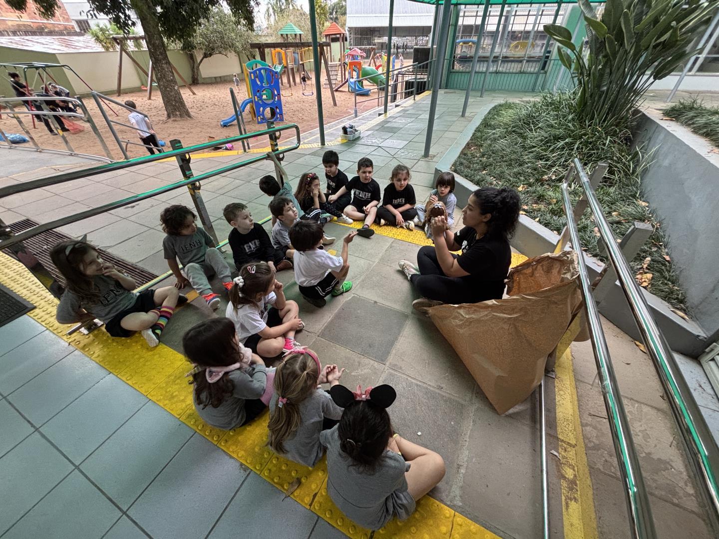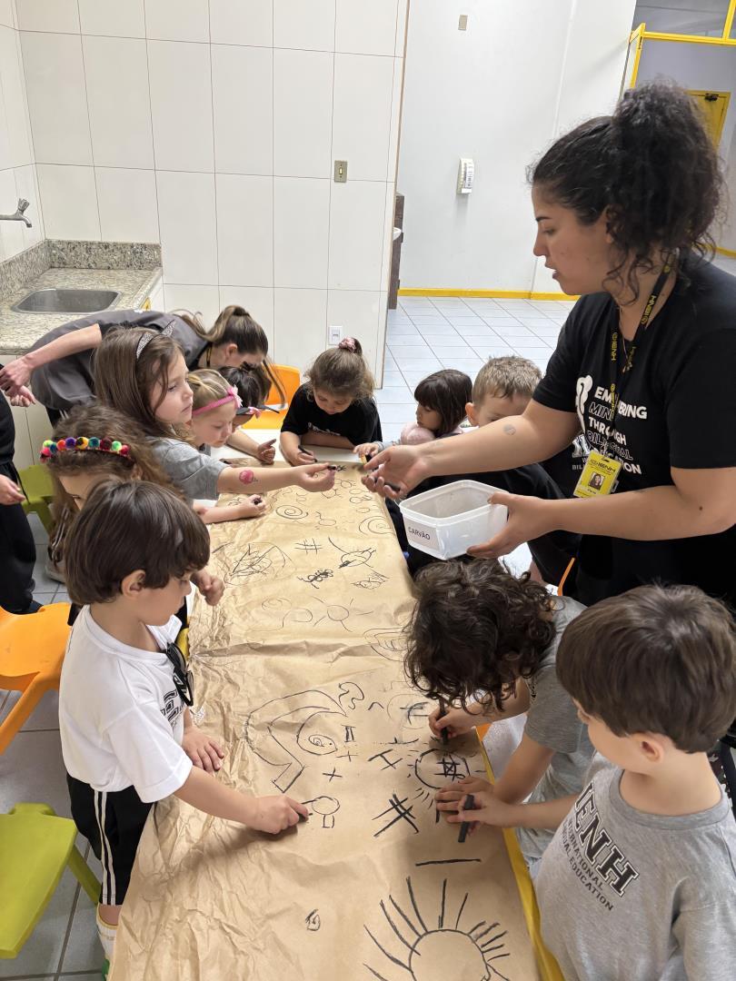 A proposta, conduzida pela professora Flavia Finamor e teacher Laura Andrioli, busca levar os alunos a compreenderem a escrita como uma invenção humana criada ao longo da história para registrar e comunicar ideias, sentimentos, desejos e conhecimentos.