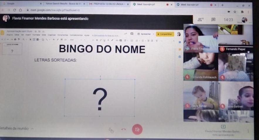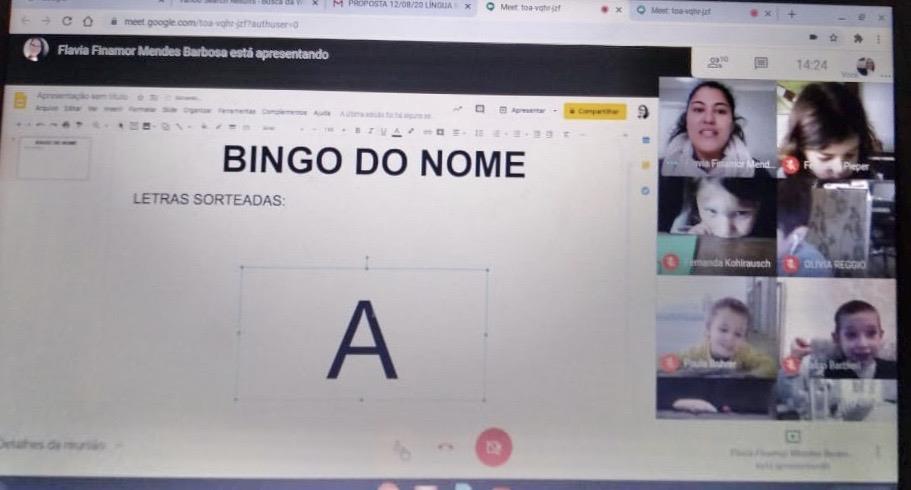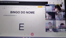 Realizaram também o jogo do BINGO, adaptado para a exploração das letras. Segundo a Professora Flávia Finamor, o jogo possibilitou a aproximação espontânea da escrita de forma divertida e lúdica, oportunizando que as crianças fizessem contagens matemáticas da quantidade de letras e de pequenos desafios a cada vez que completavam o bingo.
