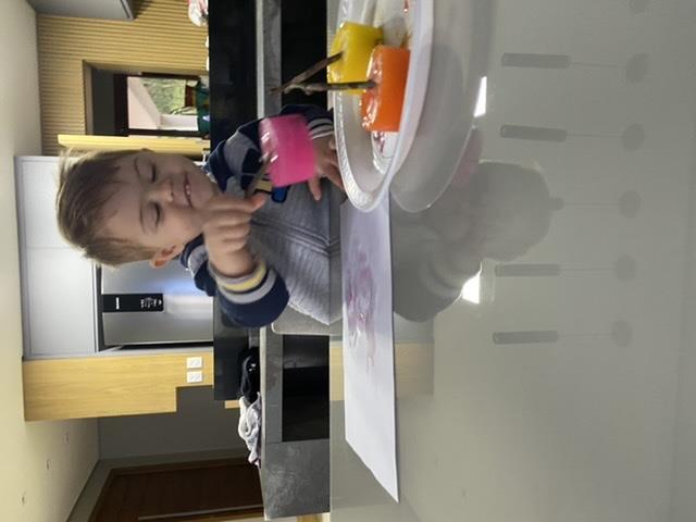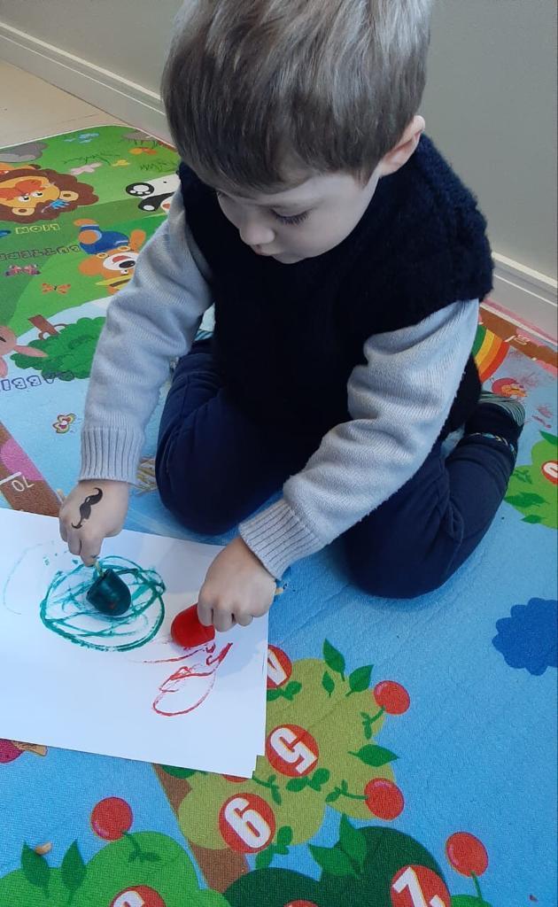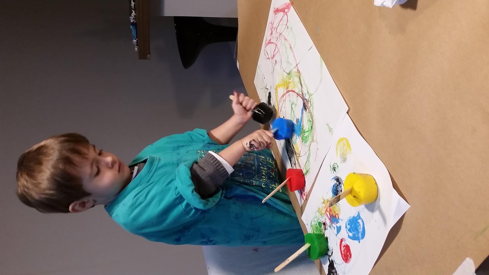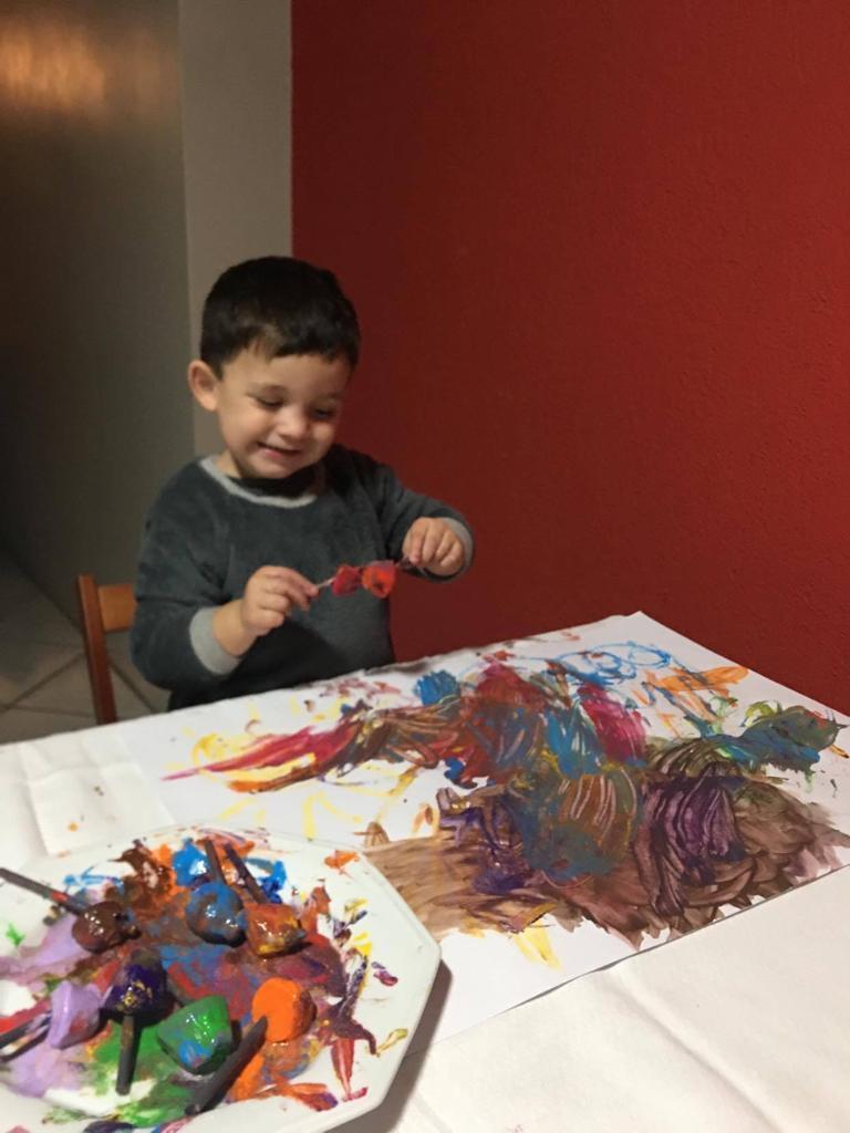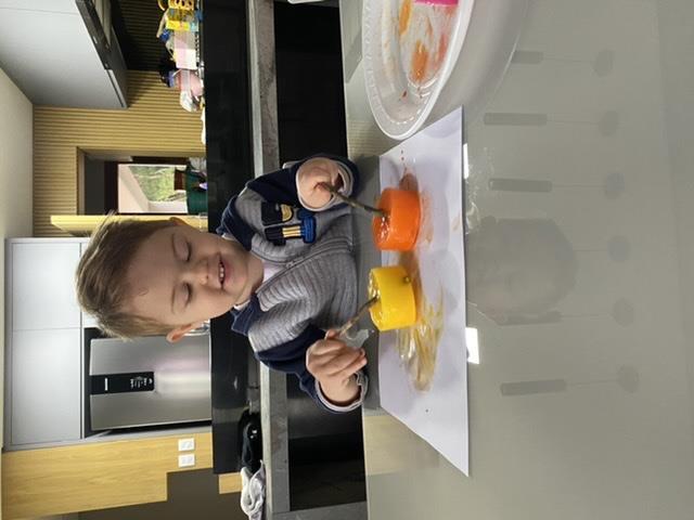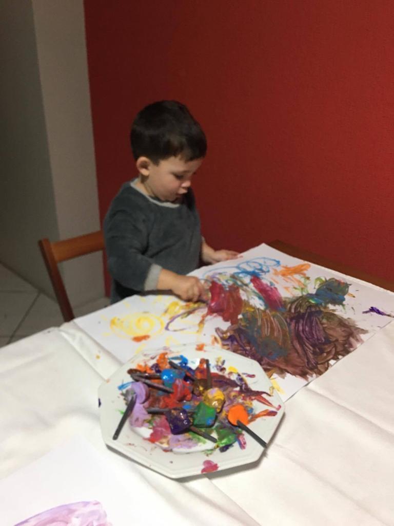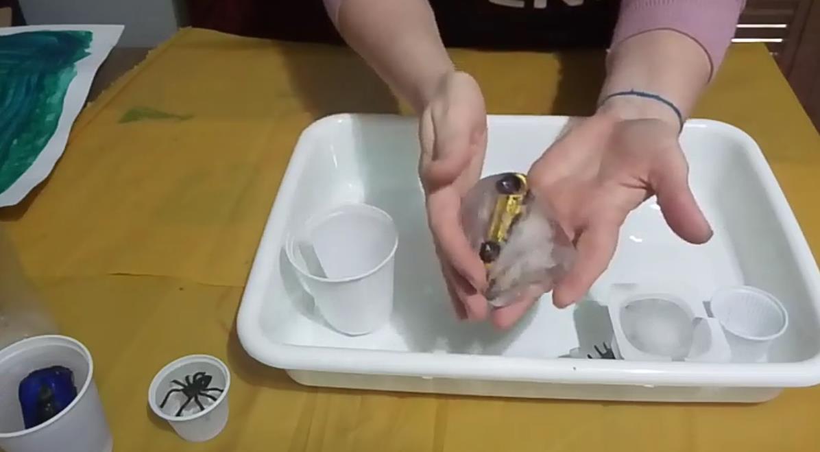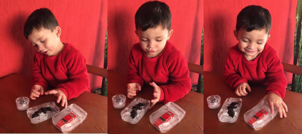 Em seguida, os alunos puderam pintar com a tinta enquanto derretia, logo voltando a ser líquido novamente. Também foi proposto que os alunos congelassem um brinquedo ou um objeto pequeno, colocando dentro de um copinho com água. Com o objeto congelado puderem observar o processo de descongelamento.