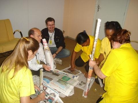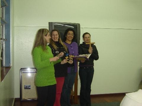 Durante a reflexão, os colaboradores representaram a Visão, Missão, um dos Valores e Princípios da IENH através de teatro, criação de músicas, colagem e montagem com materiais de sucata.