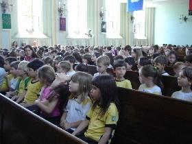 Após, os alunos das 3as séries caminharam até o altar, cantando, e lá colocaram objetos que representavam as coisas pelas quais desejavam agradecer. No altar, os estudantes colocaram em agradecimento “casa”, “bichinhos de pelúcia”, “livros”, entre outros.