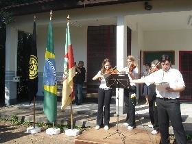 Já na Unidade Fundação Evangélica, a Cavalgada foi recebida com muita alegria pelos alunos, que “tocaram” em alguns cavalos. Houve o canto do Hino do Estado e após, o Grupo de Violinos da IENH tocou duas músicas. Um dos cavalarianos acendeu a Chama Crioula e houve declamação de poesia.