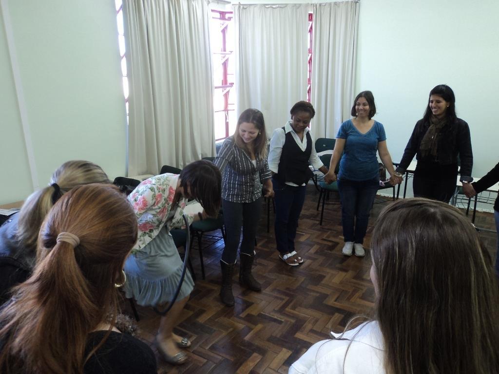 Para finalizar foi realizada uma brincadeira de integração: organizadas em uma roda e de mãos dadas todas precisavam encontrar uma forma de passar um bambolê por todo grupo, sem soltar as mãos.