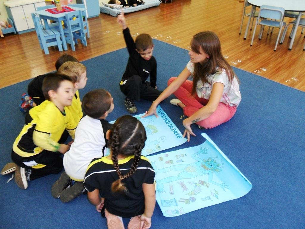 Ana apresentou aos alunos o “soldado da saúde”, fazendo referência a alimentos saudáveis, e o “bicho da porcaria”, referenciando alimentos pouco ou nada saudáveis.