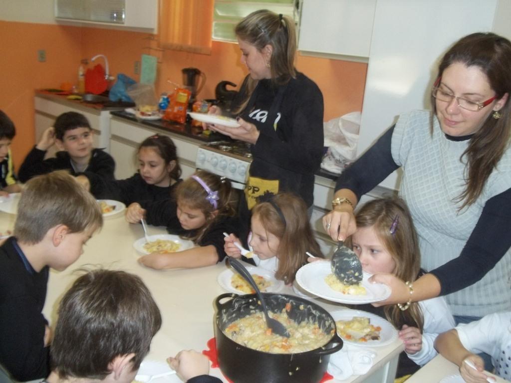 As professoras Jaqueline Hansen, Juliana Bohn e Sheila Gallina organizaram então, no dia 02 de maio, uma atividade a partir da lenda sobre a sopa de pedra (saiba mais sobre a lenda clicando aqui e aqui). Contada e dramatizada pelas professoras em Inglês e em Português, a lenda permitiu que os alunos vivenciassem o preparo desta deliciosa e mágica receita.