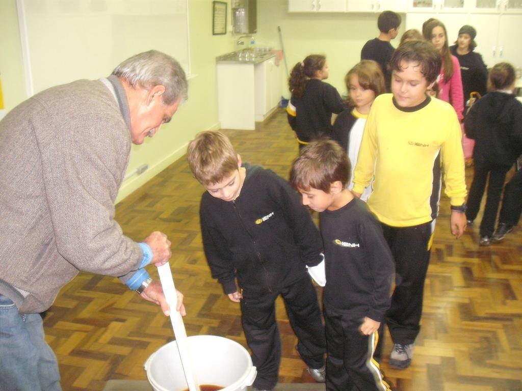 Os estudantes acompanharam cada passo do processo e auxiliaram, colocando alguns ingredientes no recipiente e mexendo-os para misturar. Depois de pronto, o líquido foi colocado em diversos potes levados pelos alunos para ficar sólido.