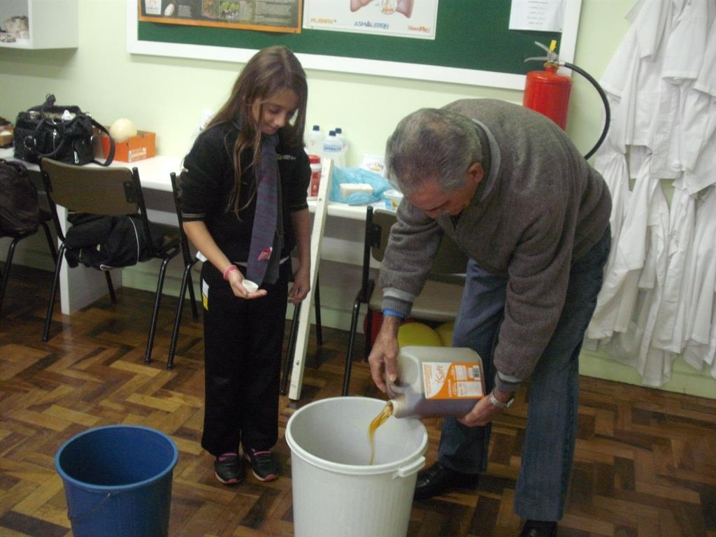 No encontro realizado dia 26 de abril, os Monitores Ecológicos da IENH – Unidade Oswaldo Cruz receberam a visita do senhor Aristeu Serini, pai da professora Denise Kuhsler. Serini ensinou os estudantes a fazerem sabão frio.