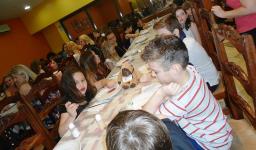 Ao chegar na pizzaria, alguns estudantes receberam curiosidades sobre a pizza e leram para o grupo. Em diversos momentos ao longo do jantar, a professora Lisiane utilizou o mascote Gorilla para indicar aos alunos o início do Gorilla Moment (momento em que somente a Língua Inglesa poderia ser utilizada).