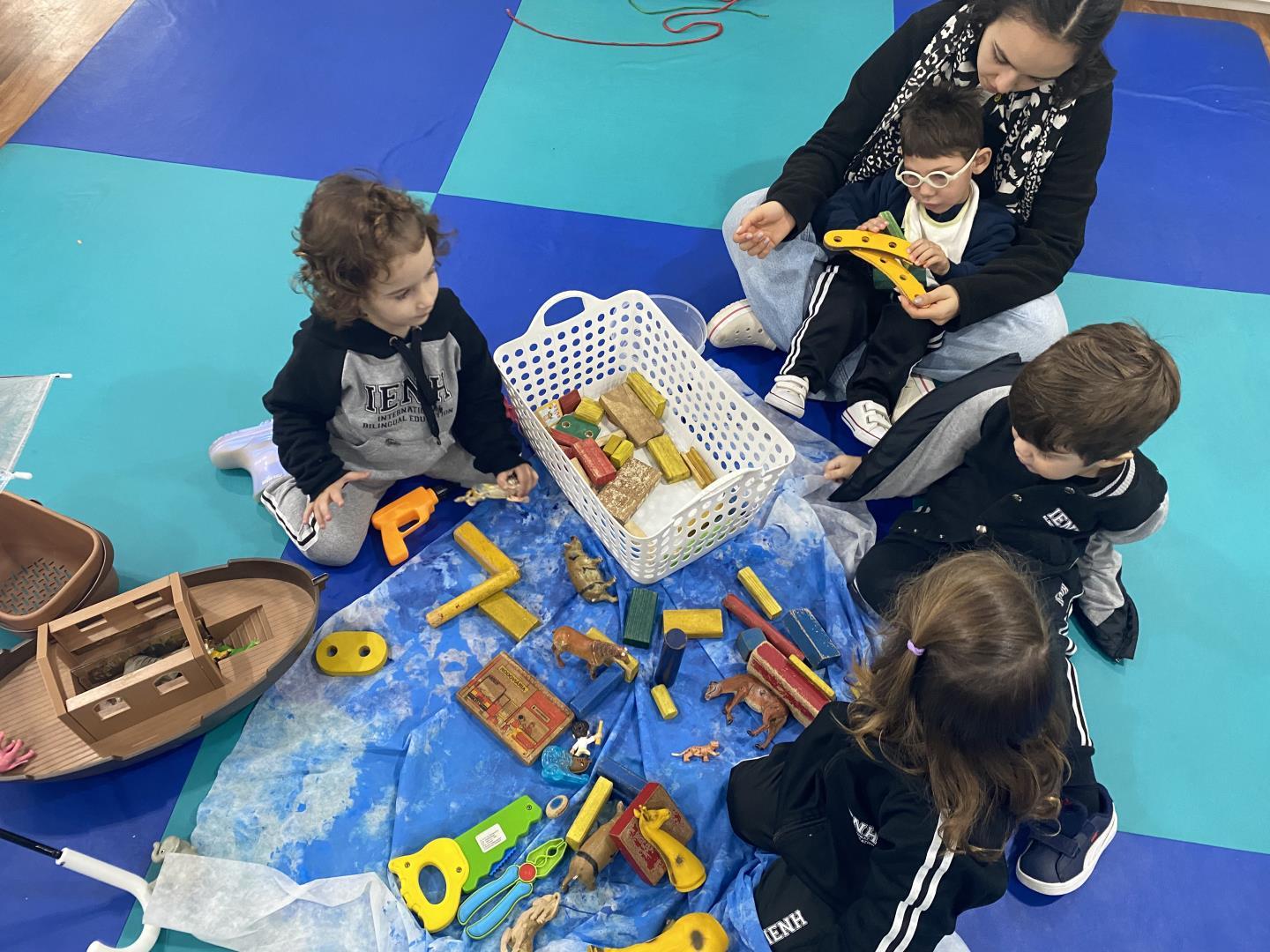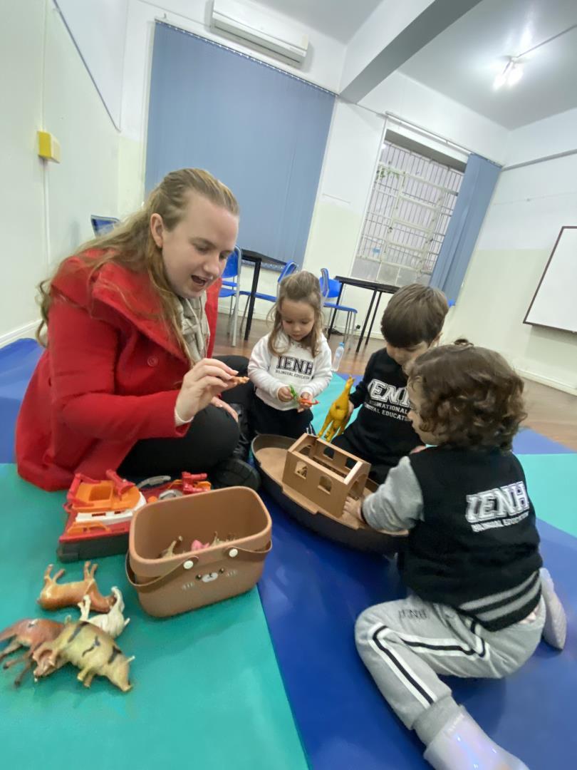 Raquel narrou para a turma a história bíblica “A Arca de Noé” usando recursos visuais lúdicos e envolventes. Posteriormente, as crianças ouviram novamente a história na sala de aula e exploraram os objetos usados na narrativa, além de montarem suas próprias “arcas” usando peças de madeira e ferramentas.