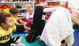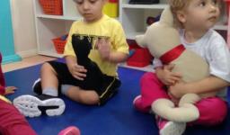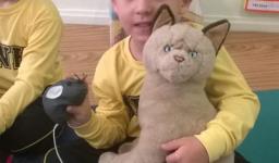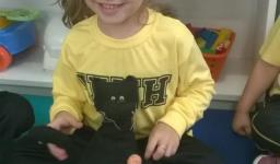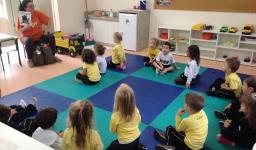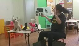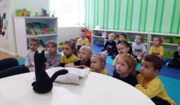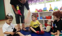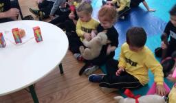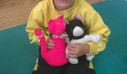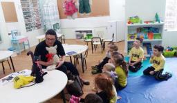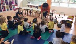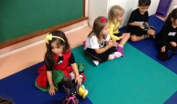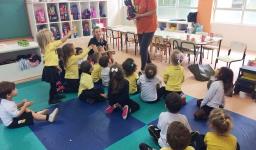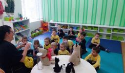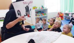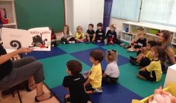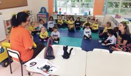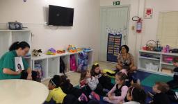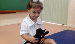 No mês de março, “Tato, o gato” foi a história contada pela Professora Denise. Nas salas de aula, inicialmente, os alunos e a Professora conversaram sobre assuntos como a escola e os animais de estimação. Ao iniciar a história, os personagens de pelúcia foram saindo da sacola da Professora: o gato Tato, sua mãe, a professora Fracotinha, seus colegas, seu bichinho de estimação (ratinho Souza) e o seu lanche para o primeiro dia de escola.