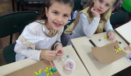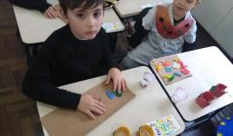Após, em sala de aula, as turmas foram misturadas e divididas em dois grupos. No novo desafio, cada grupo precisava criar um símbolo para cada letra do seu nome utilizando massinha de modelar. Cada representação deveria ser inspirada em coisas que gostassem de fazer no dia a dia. Na sequência da atividade, outra proposta encerrou a tarefa: registrar por escrito os símbolos criados.
