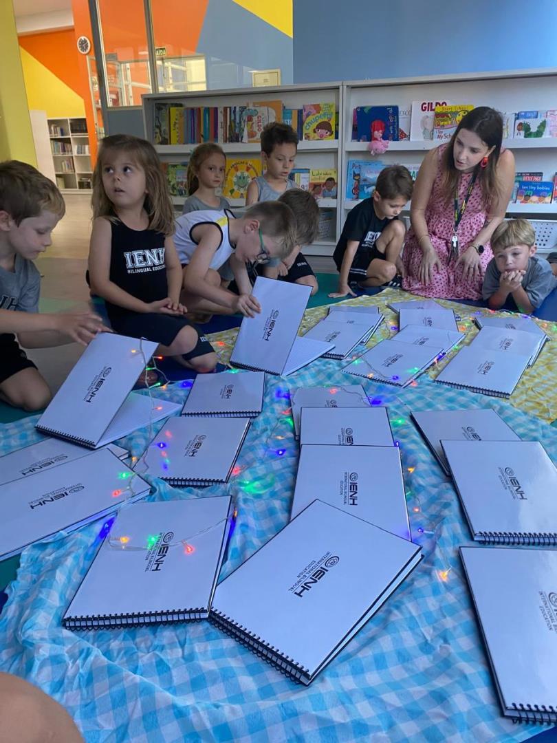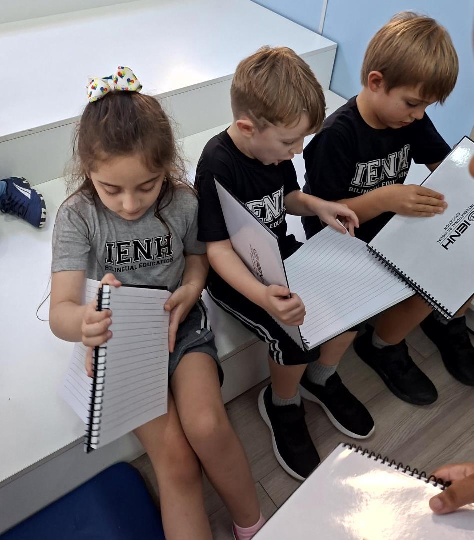As turmas do Year 1 do Ensino Fundamental do Currículo Internacional Bilíngue da IENH – Unidade Pindorama participaram de uma atividade especial durante a aula de Língua Inglesa, que uniu jogos, colaboração e uma divertida caça ao tesouro. A proposta teve como objetivo ampliar o repertório linguístico dos estudantes, promover uma tarefa colaborativa e apresentar, de forma lúdica, um material importante para a rotina do Ensino Fundamental: os primeiros cadernos.