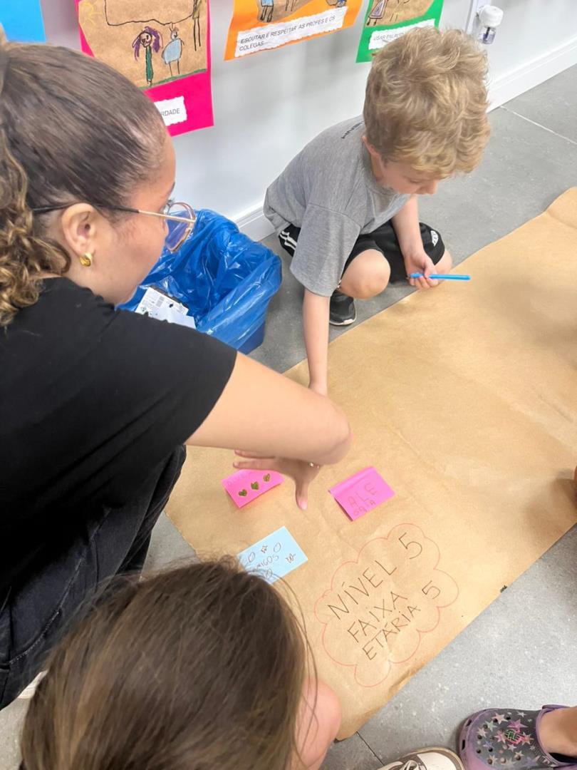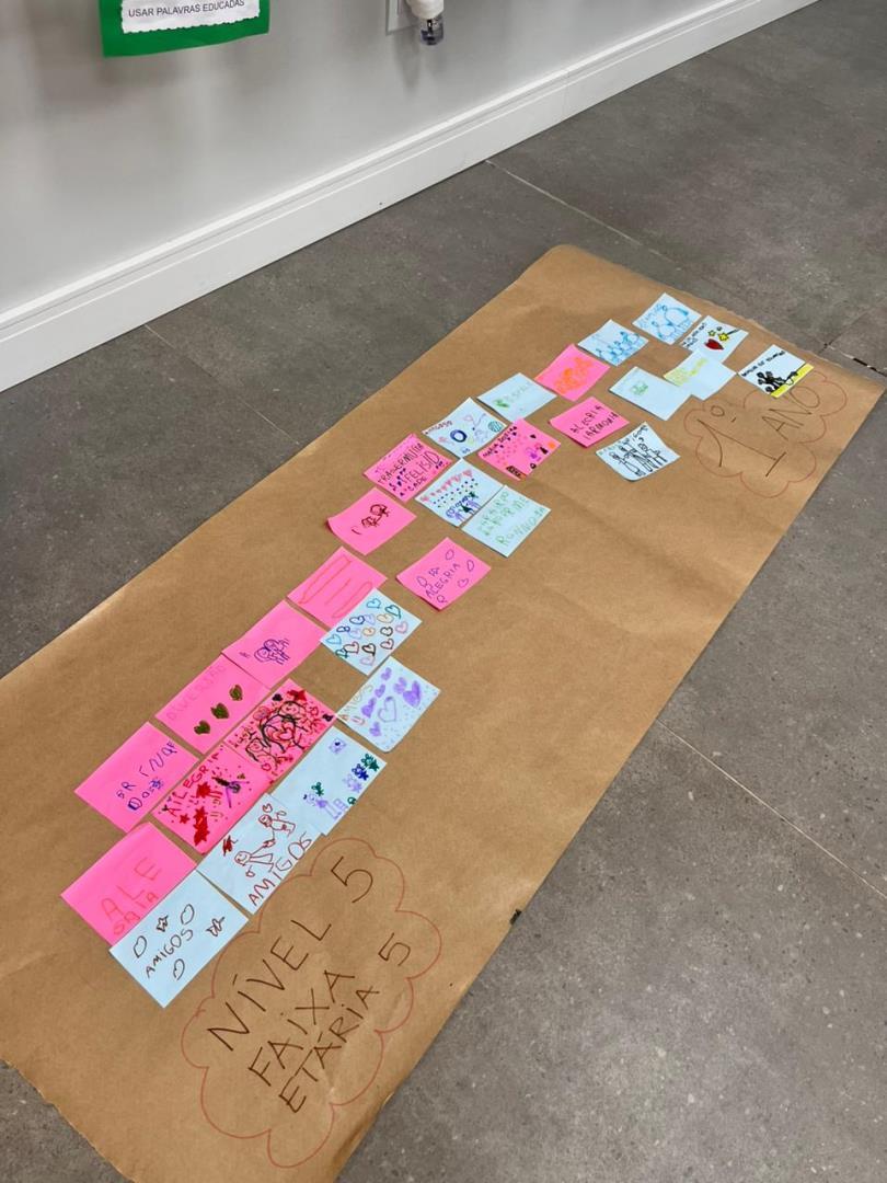Durante a atividade, as crianças participaram de uma roda de conversa, compartilhando sentimentos, medos e expectativas sobre a nova etapa escolar. Em seguida, construíram coletivamente uma “ponte”, identificando recursos de apoio, como amigos, professores, coragem e a própria capacidade de pedir ajuda, reforçando a percepção de que não precisam enfrentar desafios sozinhos.